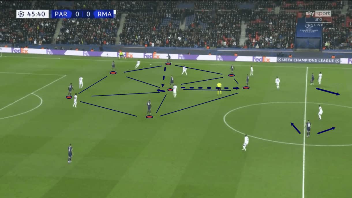 PSG’s shape in figure 4 resembles a training ground rondo but with Paredes in the centre. The ball moved around the perimeter until an opening was created for PSG to play into the centre of the structure. That opening was eventually created when Kimpembe passed the ball to left-back Mendes and Paredes dropped slightly deeper to remove himself from Modrić’s cover shadow, making himself available for Mendes to find in his deep central position.