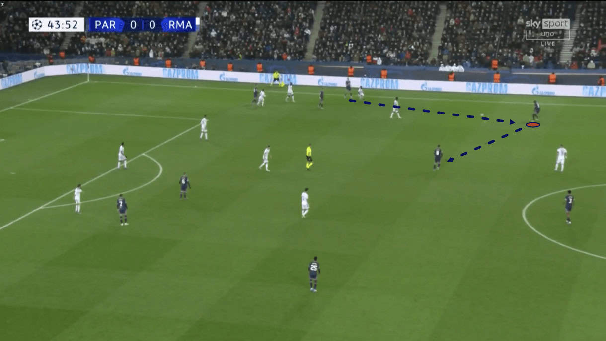 As PSG progressed into more advanced areas of the pitch, Pereira was always on call to be positioned in an area where he could act as a safe way out of pressure for the more advanced players, should Madrid’s defence shut them out and prevent them from progressing any further. Take figure 13, for example. Here, just before this image, Messi had carried the ball forward from deep before laying it off to Hakimi on the wing. However, Hakimi got trapped out wide and with Madrid bodies making all possibilities for further progression difficult, the right-back simply opted to send the ball back to Pereira, who was positioned in support of the more attacking players on the right-wing in an area of little pressure, as highlighted in the image above.