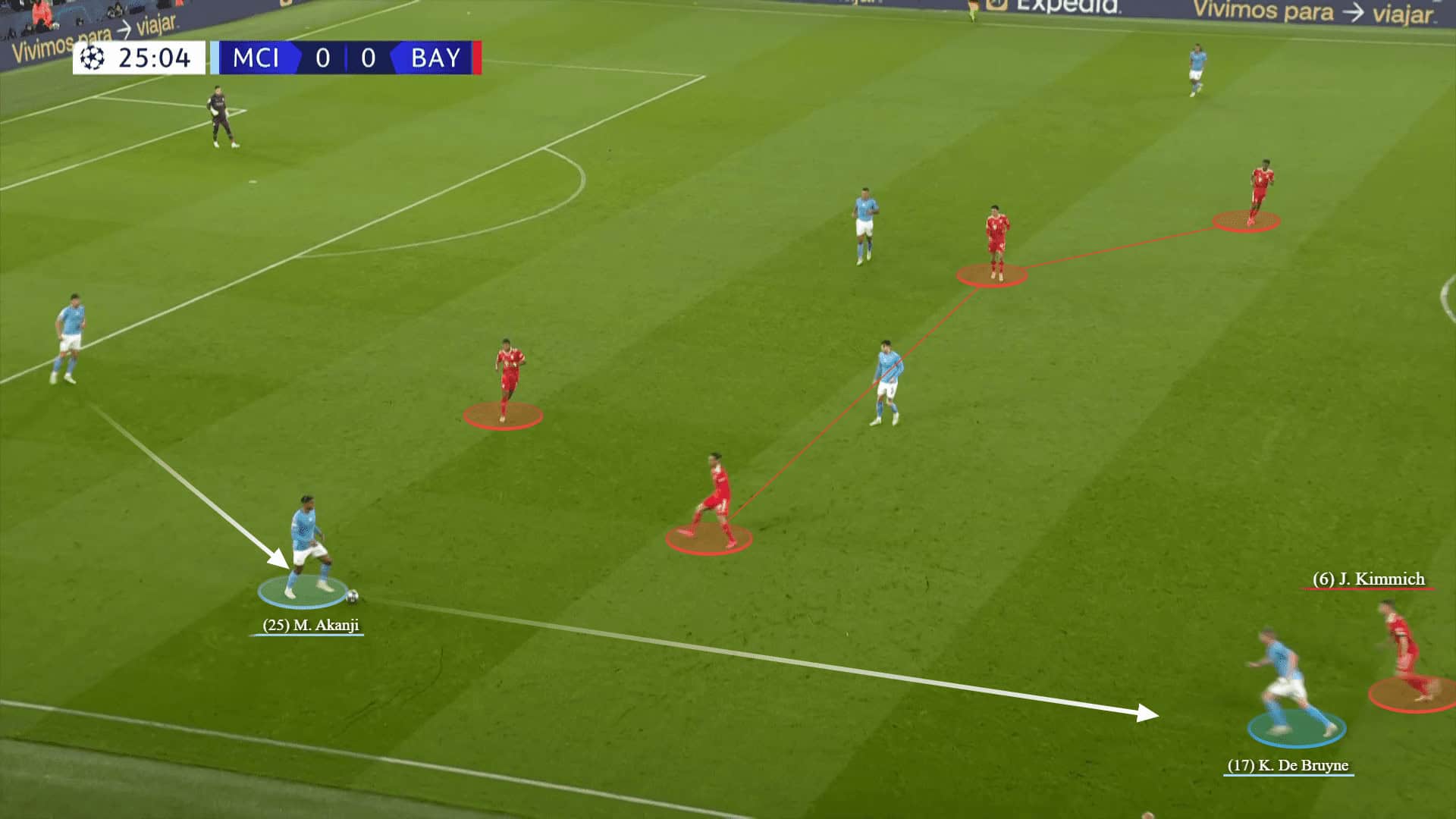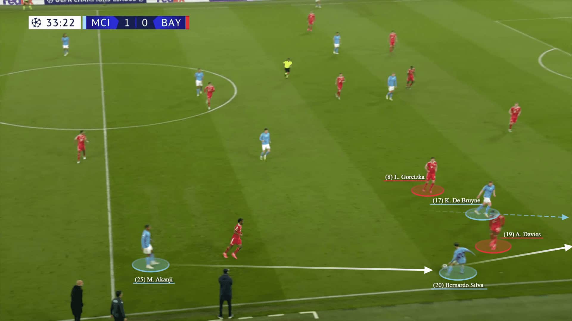 What if he follows De Bruyne’s suggestion rather than these long diagonals? — In the below scene, Akanji passes to Bernardo who quickly delivers the ball on the same line behind Davies to the runner De Bruyn. Meanwhile, there is some bad tracking from Goretzka.