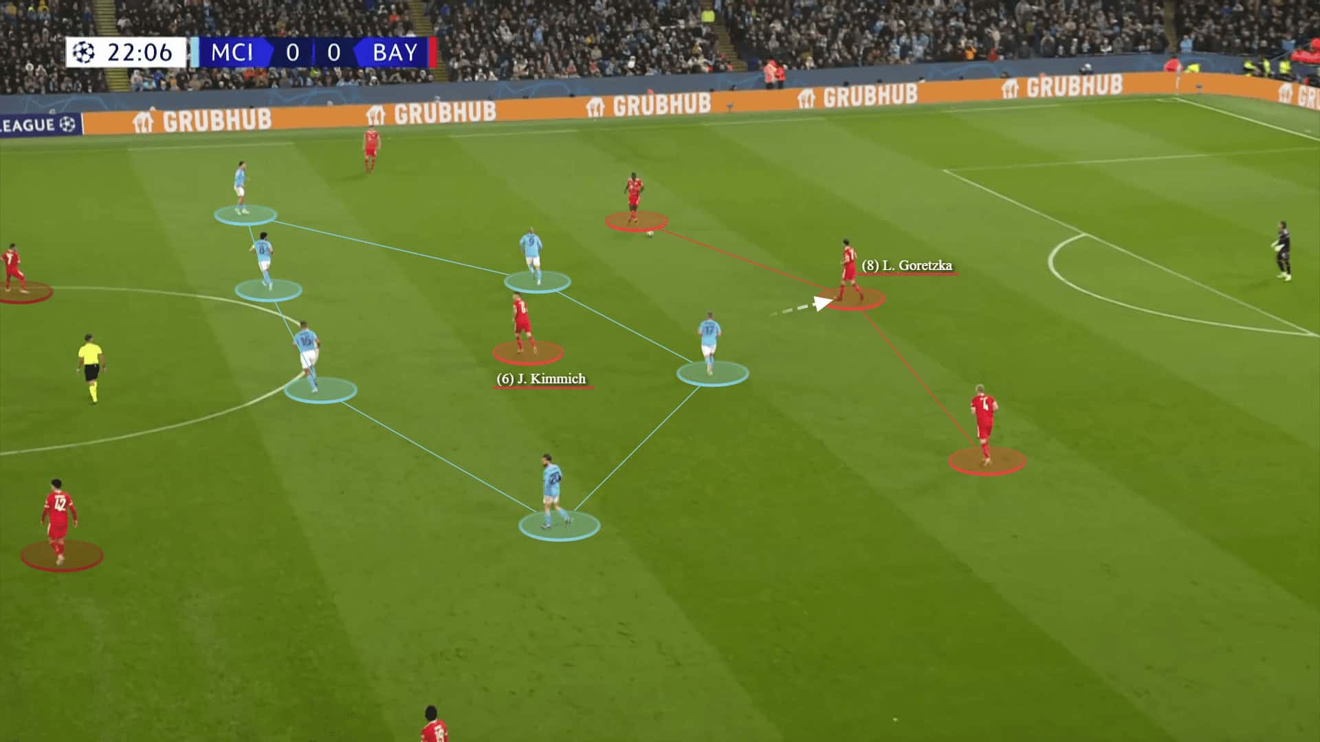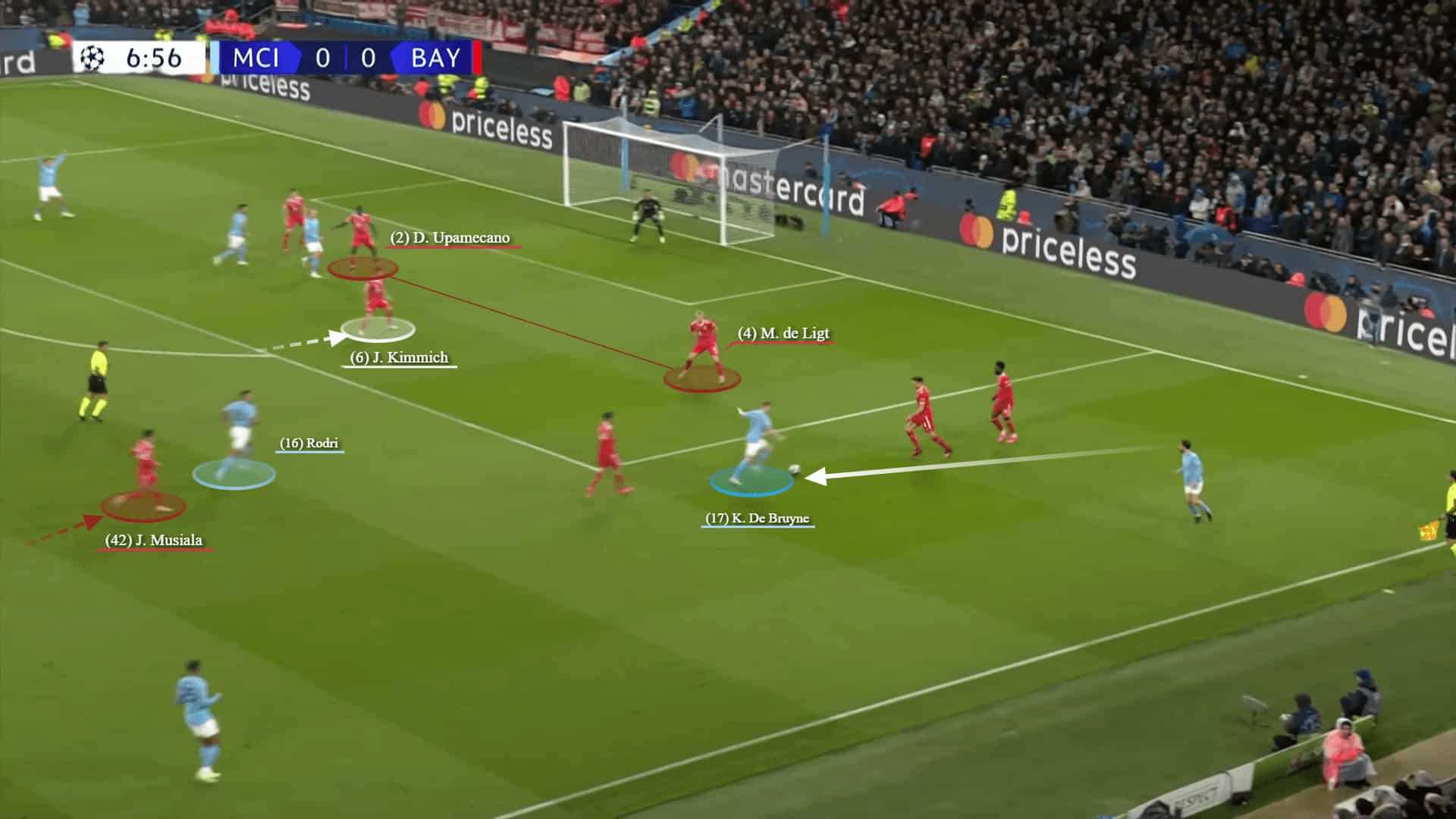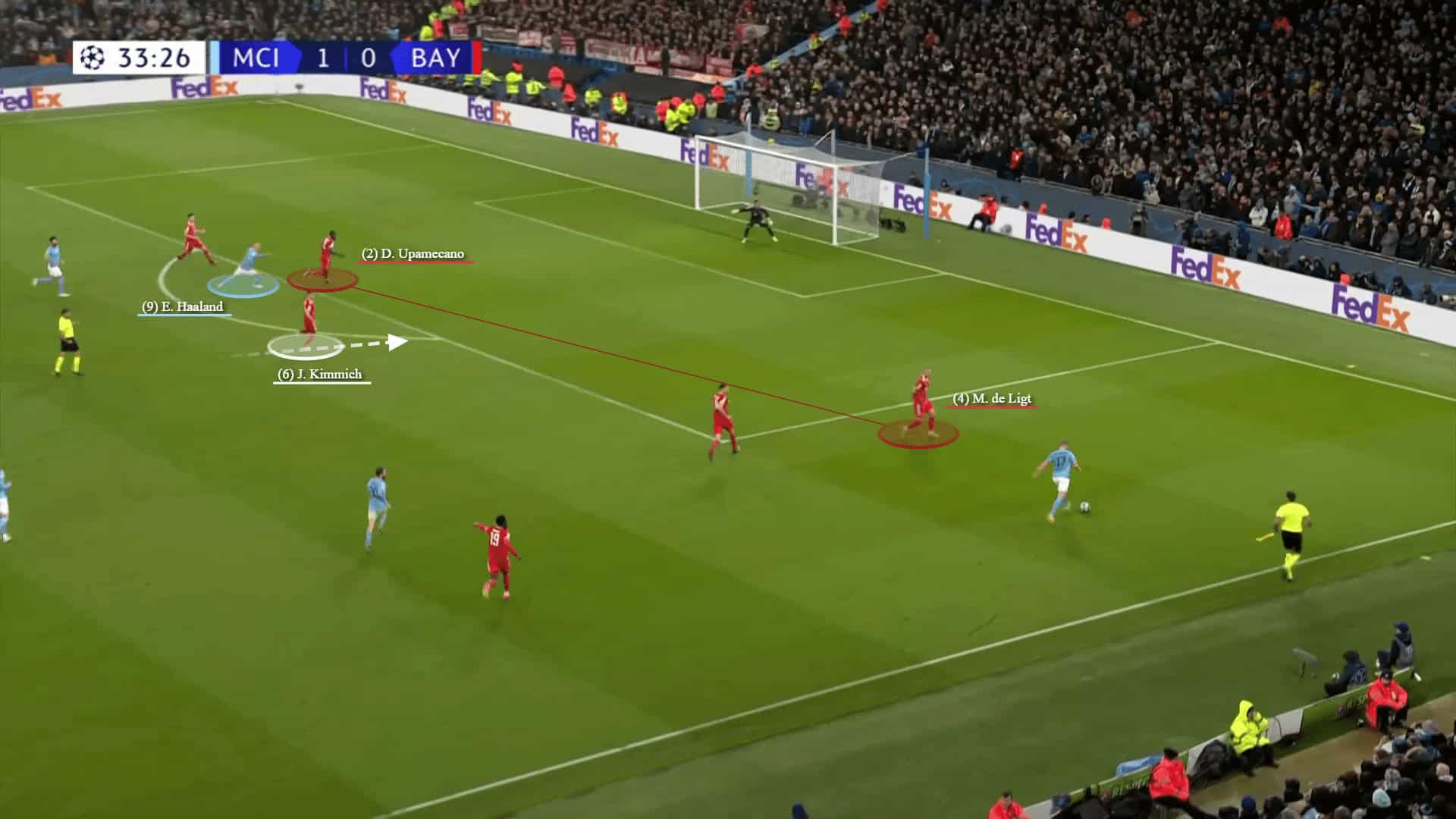 It seemed that Bayern were aware of this and Kimmich usually dropped to plug this generated space. In the below graphic, City have the ball on the flank. While De Ligt was dragged and Haaland pinned Upamecano away, Kimmich is dropping and Musiala is responsible to mark Rodri around the box.