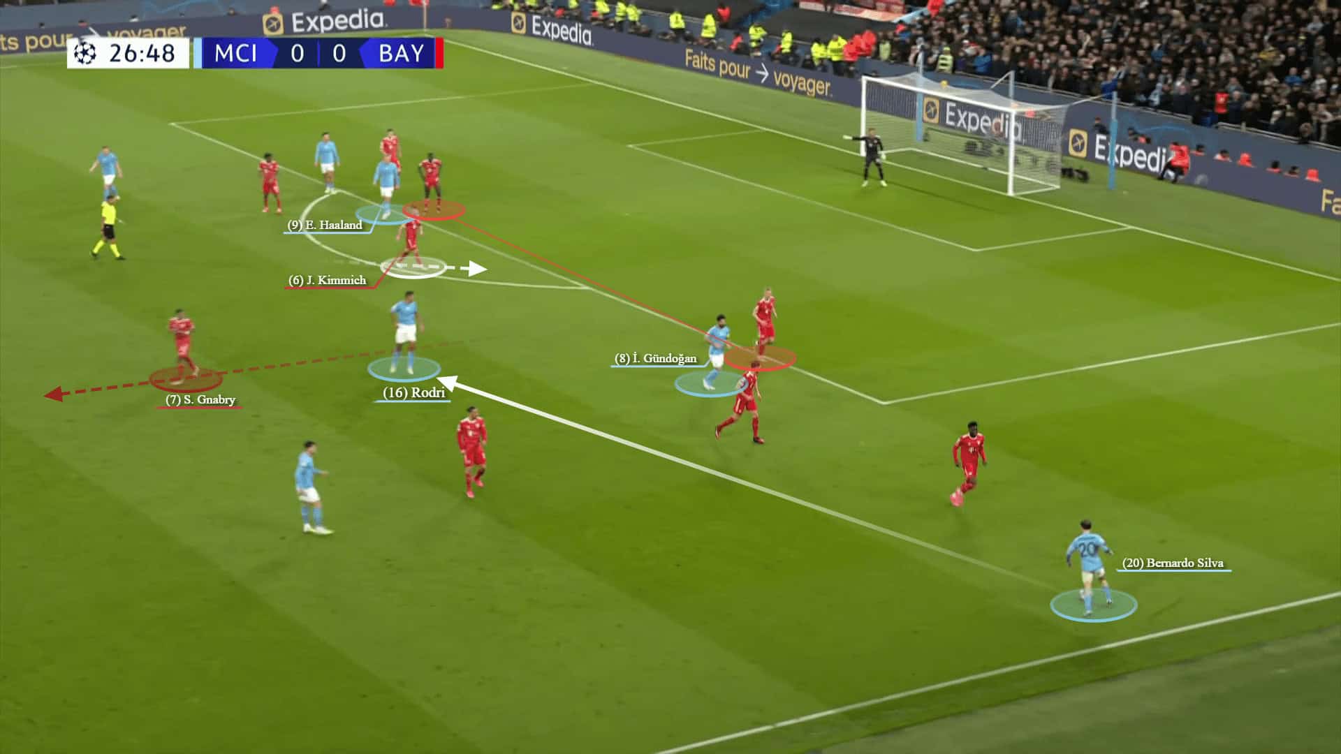 The goal scene was exactly from the same pattern. Bernardo here plays in the depth toward Rodri who was left awkwardly by Gnabry
