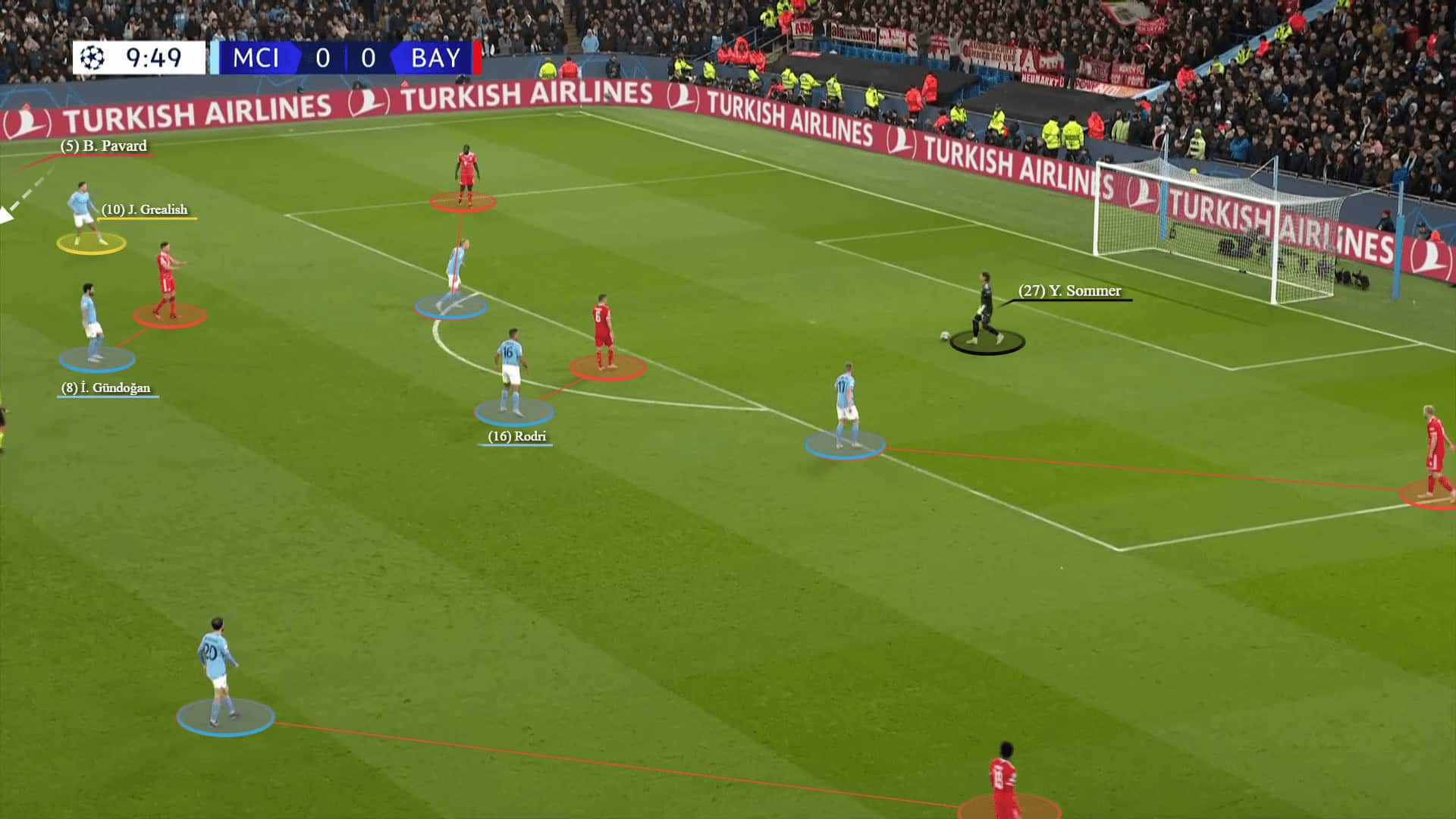 Mostly this approach forced the ball toward Sommer who did not find a valuable solution except for the long ball to the last line where City had a 6v4 there.