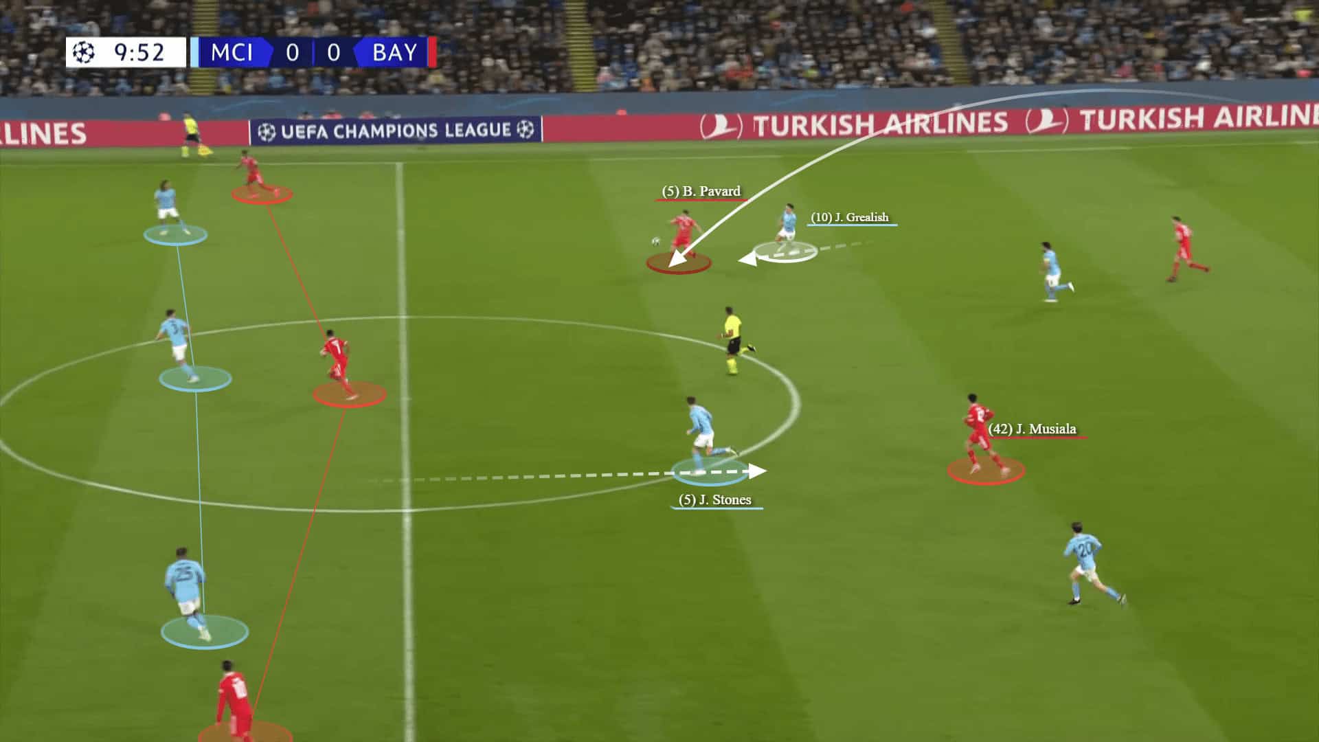Here, in the below graphics, Sommer plays a long ball to Pavard who moves behind Grealish. Meanwhile, Stones reacted to the dropping of Musiala.