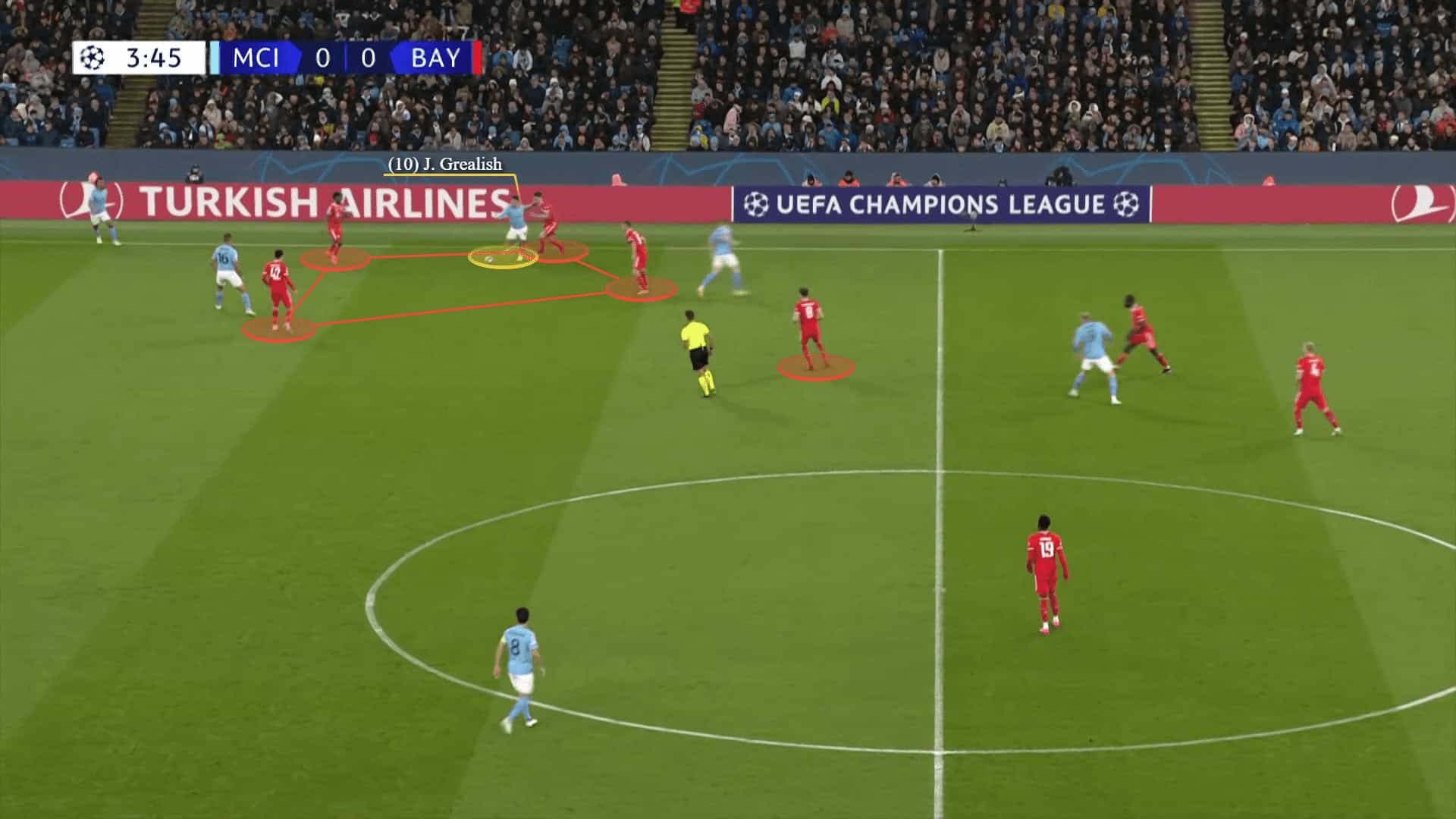 Firstly, Haaland and De Bruyne start actively in front and press both centre-backs while covering the shadow of both Bayern’s defensive midfielders. At the same time Rodri and Gundogan push forward to press them, and Grealish and Bernardo are closing the lanes to the fullbacks.
