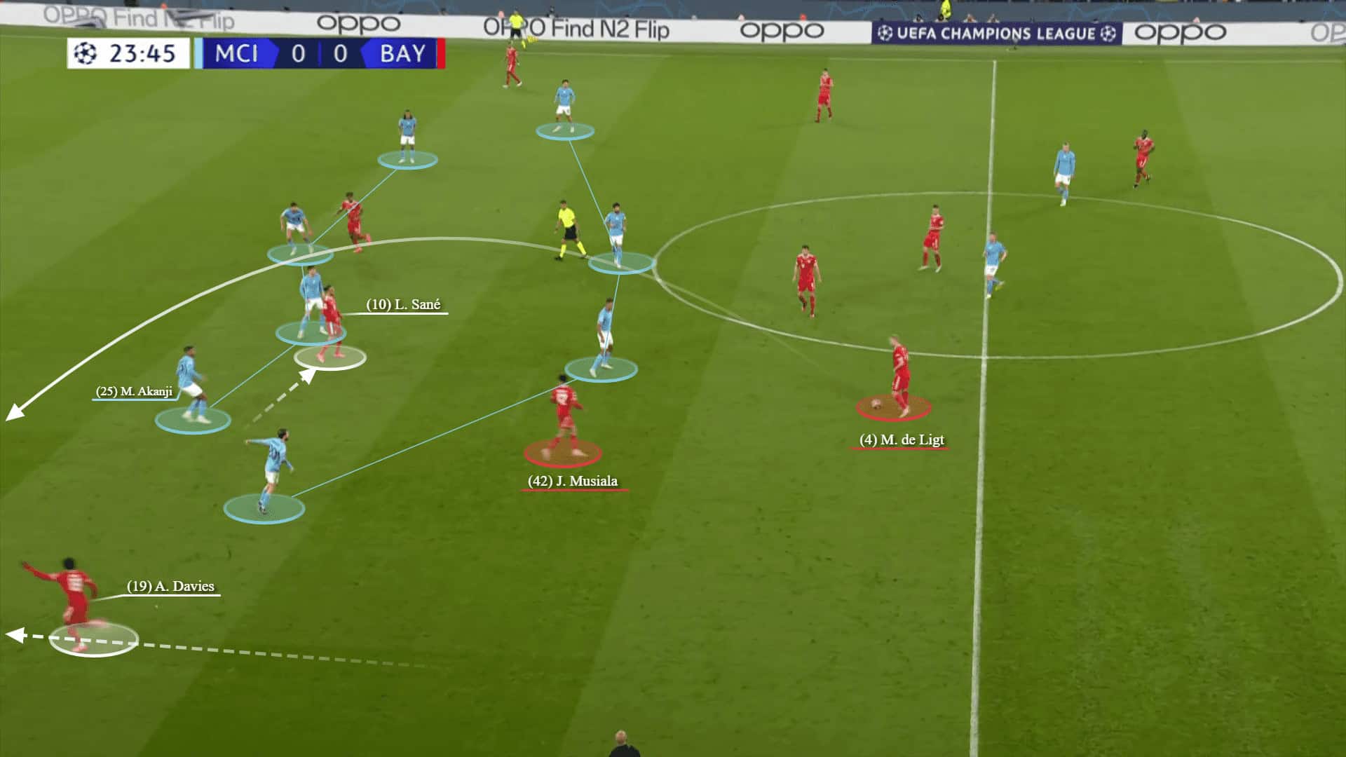 This form predominantly creates a roam for the wide centre-backs. Here below, De Ligt bypassed the first line of the press while Musiala is on the interior corridor and Sane moves inside which takes the attention of Akanji.