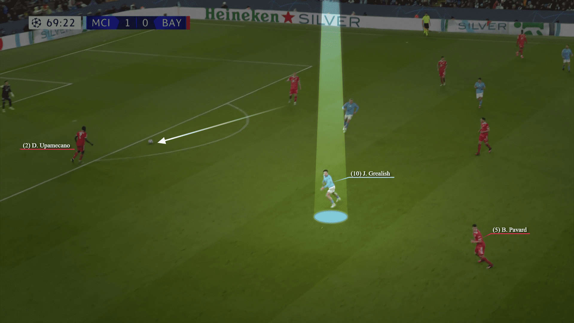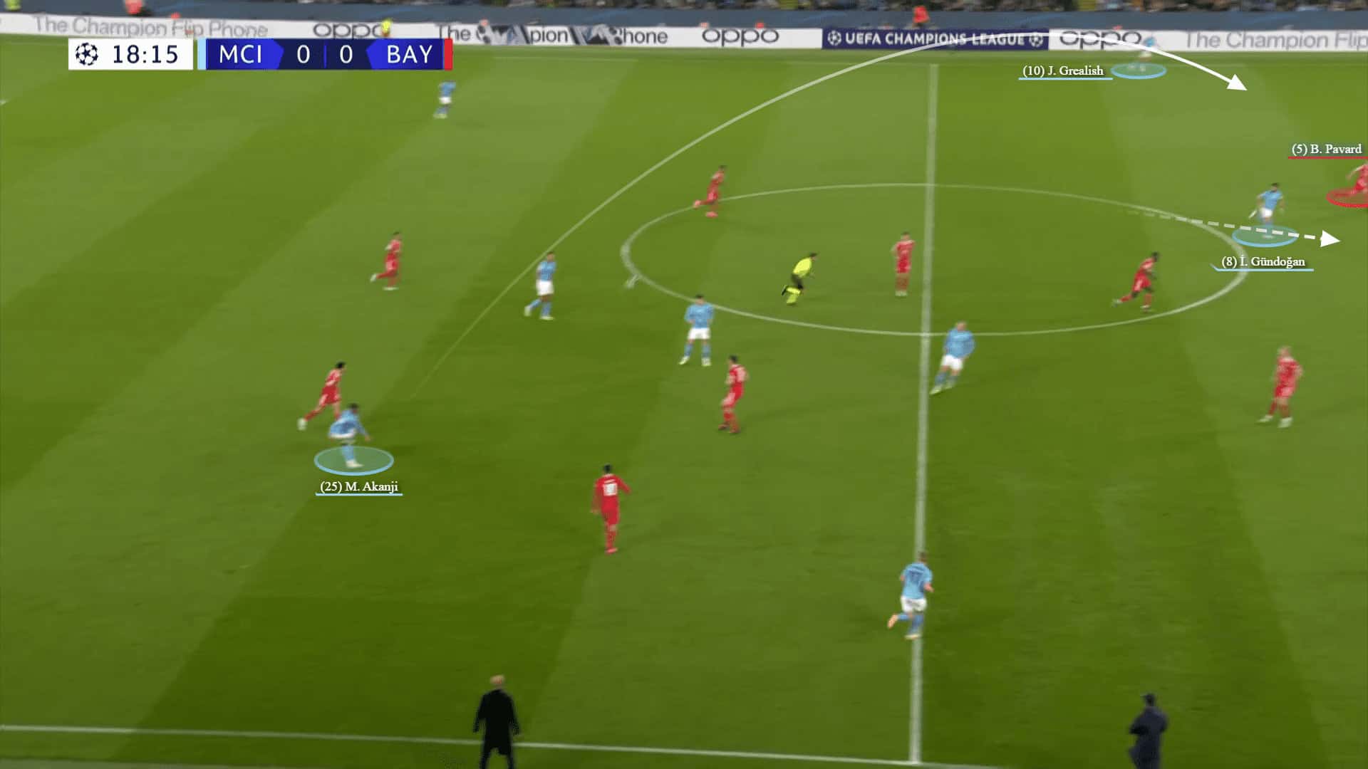These circumstances made Nathan Ake and mostly Akanji important in the progression. In the below graphic, after receiving and luring Bayern to the right side, Akanji switches the play to the weak side to Grealish. Meanwhile, Gundogan is manipulating the opposite fullback Pavard with a fake run in the half-space.
