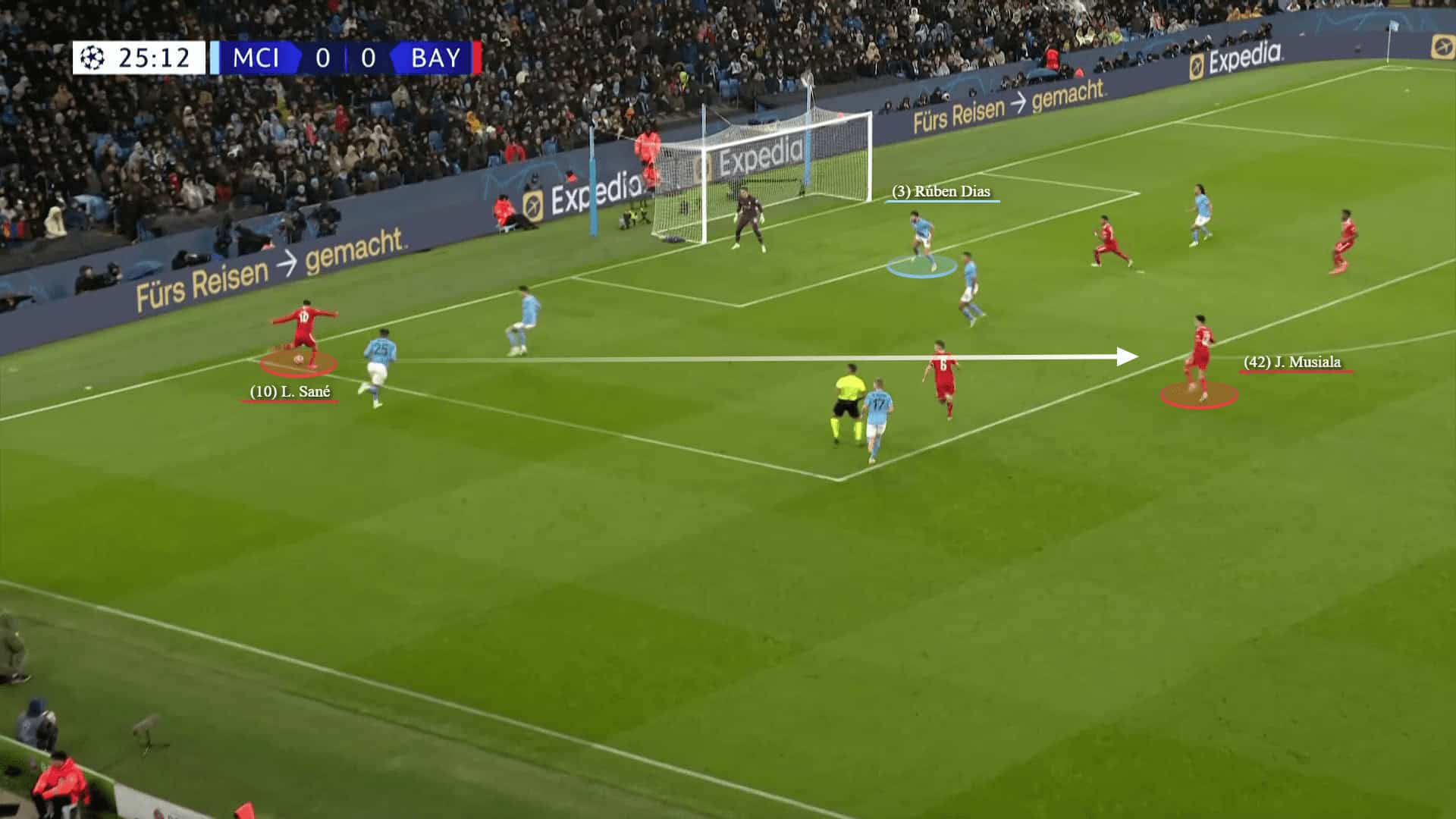 — and then Sane cut the ball back to Musiala, yet Dias was the hero of the scene and saved a genuine goal.
