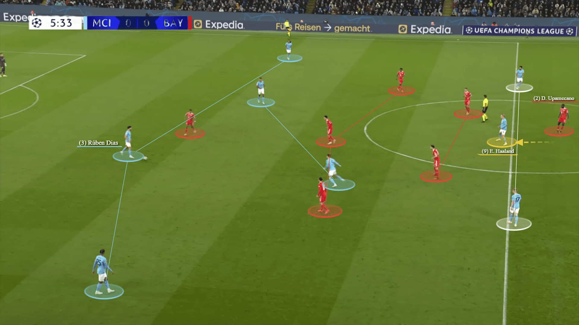 Pep Guradiola’s team there is maintaining the 3-2-2-3. Here below, while Bayern Munich keep the same 4-2-3-1, Haaland drops off to add an option but is followed by Upamecano.