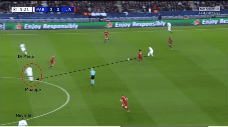 Most of the time Liverpool’s central midfielders, however, weren’t able to press Verratti due to the positioning of PSG midfielders and strikers. Neymar and Di María both positioned in the halfspace. Consequently, Milner and Wijnaldum couldn’t step up to press Verratti. By moving higher and then dropping deeper occasionally Neymar and Di María supported the build-up but simultaneously created space for their defensive midfielder. The only player left was Henderson who as I already mentioned isn’t the player who can press Verratti. Sometimes Mbappé would even drop when Henderson pressed higher using the open space which could get dangerous for Liverpool when they overcame the first line of LFC plus Henderson.
