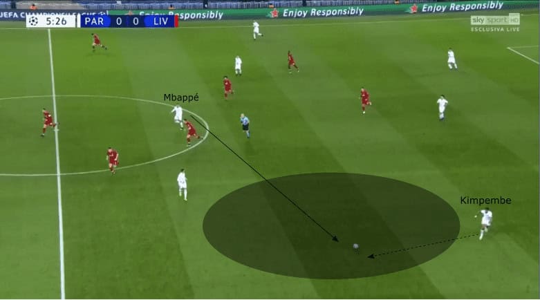 Not only centrally, but also on the wings, PSG could find an open player. Usually, the fullbacks of Liverpool pressed Paris’ wingbacks. On the left side, Juan Bernat got pressured regularly because he is one of the more dangerous attacking wingbacks. On the other side, Thilo Kehrer got more space. Under Klopp, the wingers press the halfback/centre-backs while the fullbacks cover the sideline. However, due to the clever positioning of Cavani and Mbappé between fullback and centre-back of Liverpool the defenders weren’t able to move out to press all the time. Paris St. Germain successfully created superiorities and free men in different spaces on the pitch.