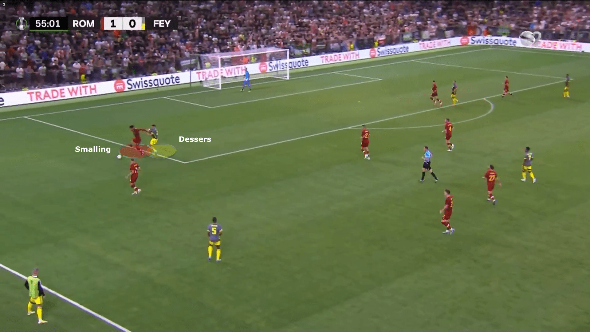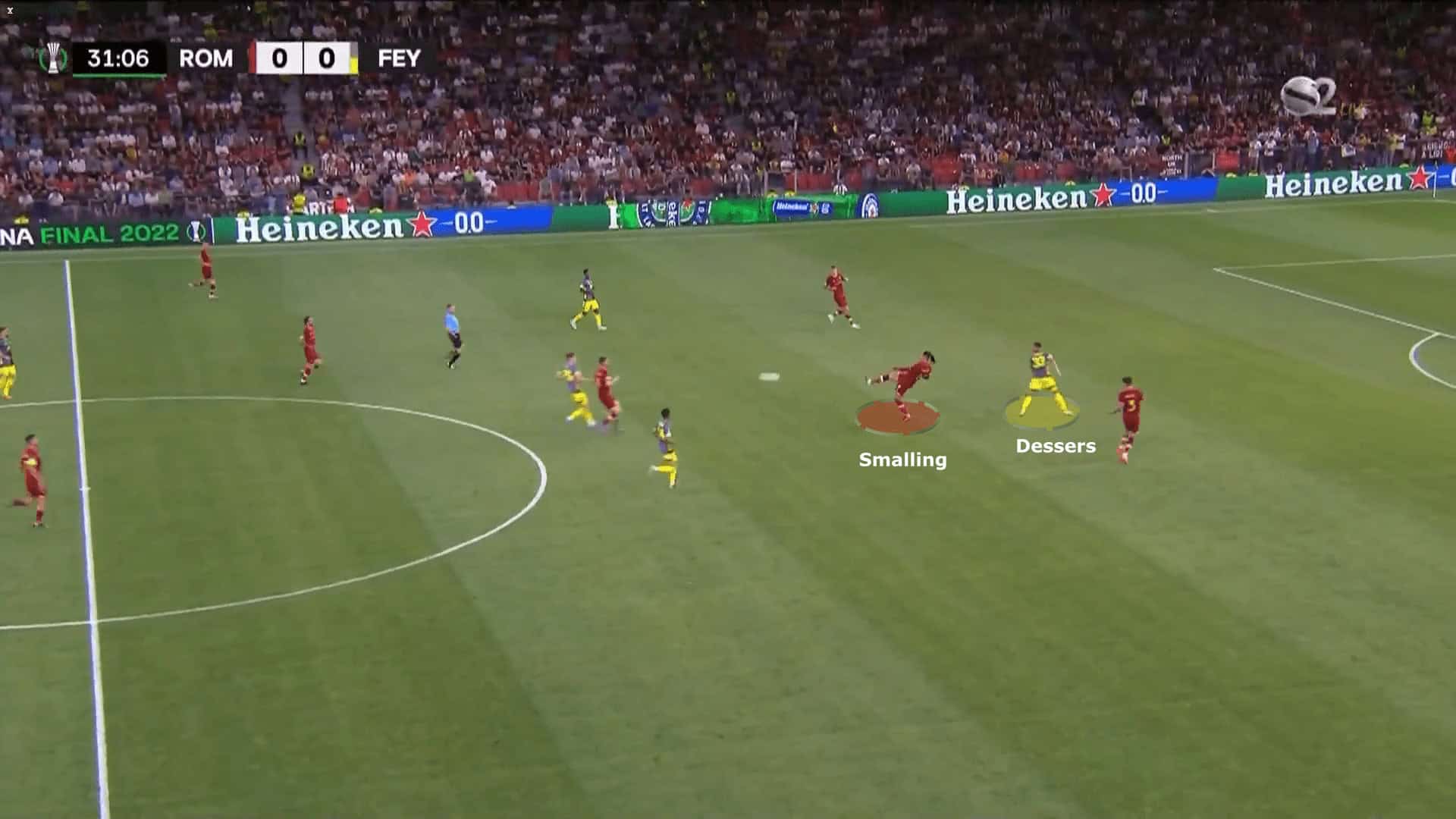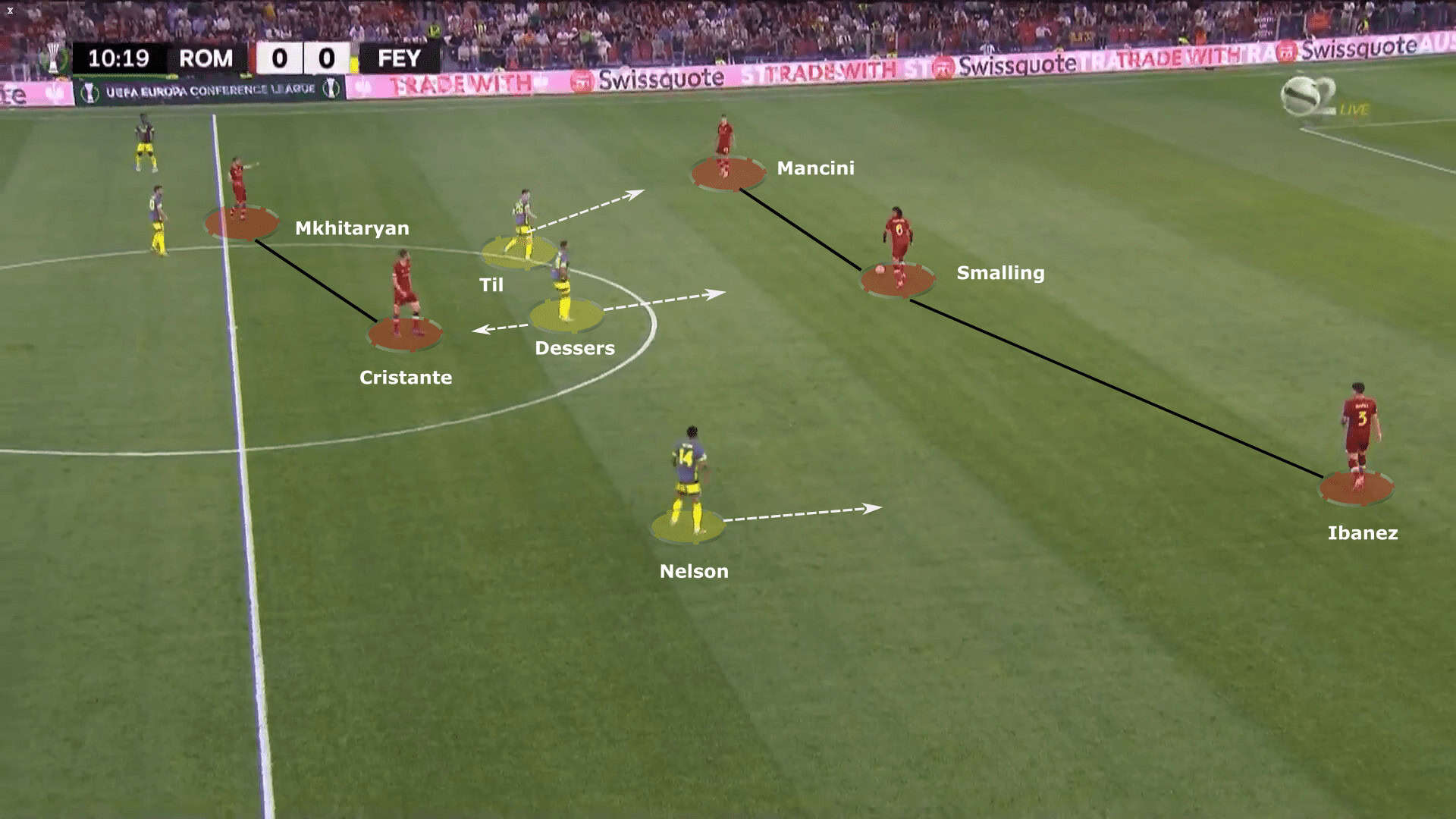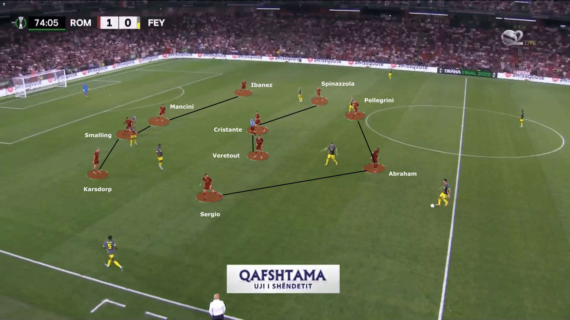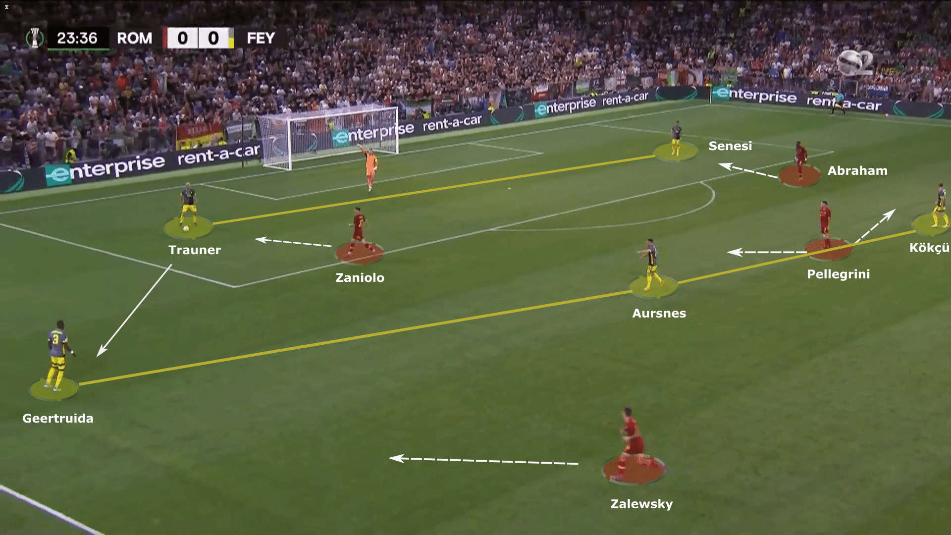 From goal-kicks, Smalling would form a triangular shape with Ibanez and Mancini, as an outlet to create more penetration against Feyenoord’s first wave of pressure. This was a replica of Mourinho’s mechanism against Leicester in the semi-finals. Feyenoord’s 4-2-3-1 shape with a high line was able to stretch Roma. Abraham and Zaniolo are too wide apart from each other, making it difficult for them to connect.