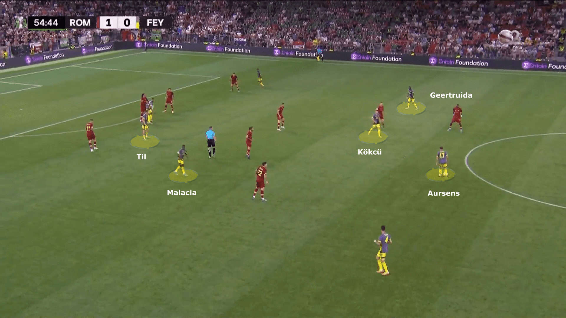 Feyenoord had a distinguishable approach relative to Roma. In possession, it looked like a 4-3-3, a model Dutch system. They tried to match Roma’s usage of wingbacks by having Geertruida and Malacia positioned high up the pitch in an attempt to stretch the opposition. Trauner and Senesi split wide. it was usually Abraham and Zaniolo who closed down the centre-backs while Pellegrini shadowed Aursnes. This meant that it fell to either wingback Karsdorp or Mkhitaryan to close down Kökçü, depending on the midfielder’s position.