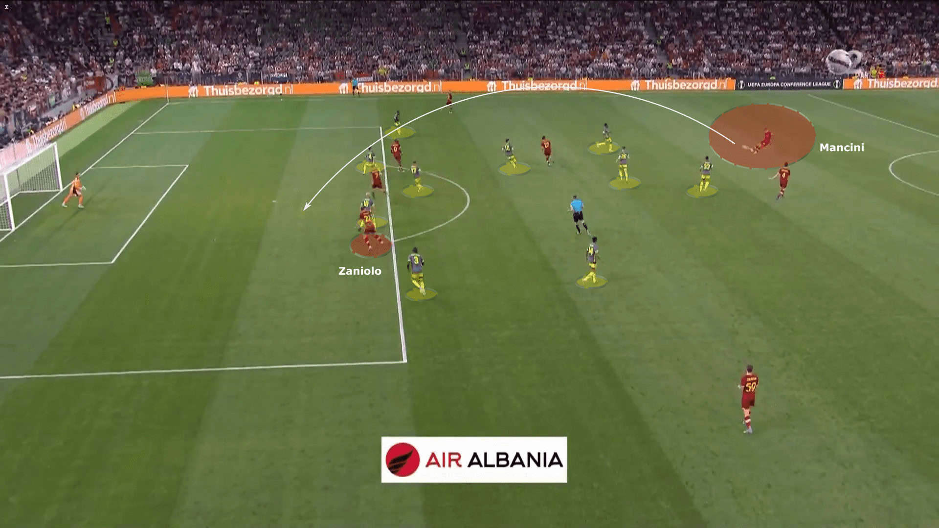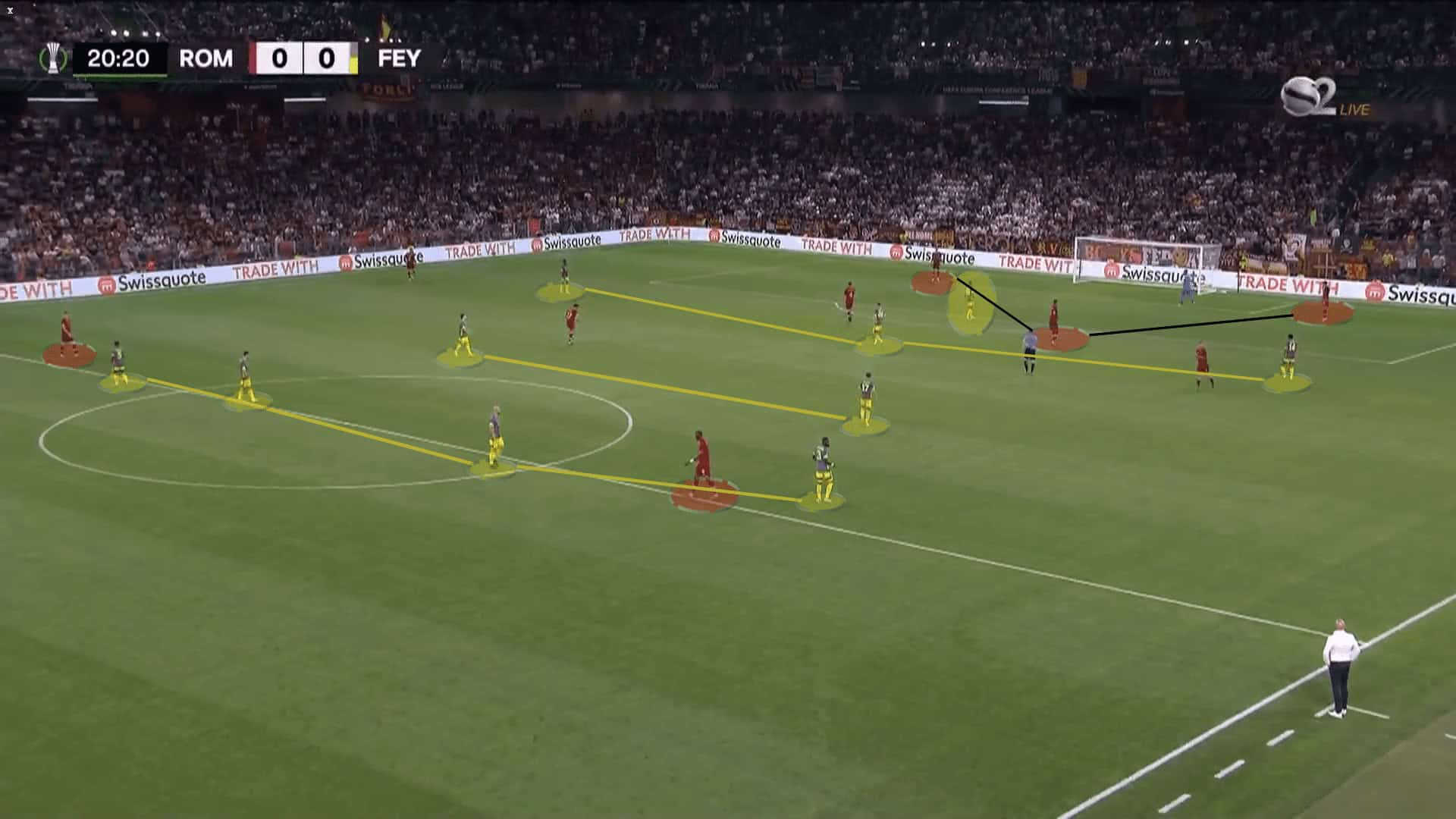 The positioning of Roma’s wingbacks was key to the team’s attacking structure. The open spaces offered to Karsdorp and Zalewski proved an issue that the Eredivisie side never truly solved in the first half. The pair did not make major attacking contributions, but their positions high up the pitch forced Feyenoord to cover them deeper.
