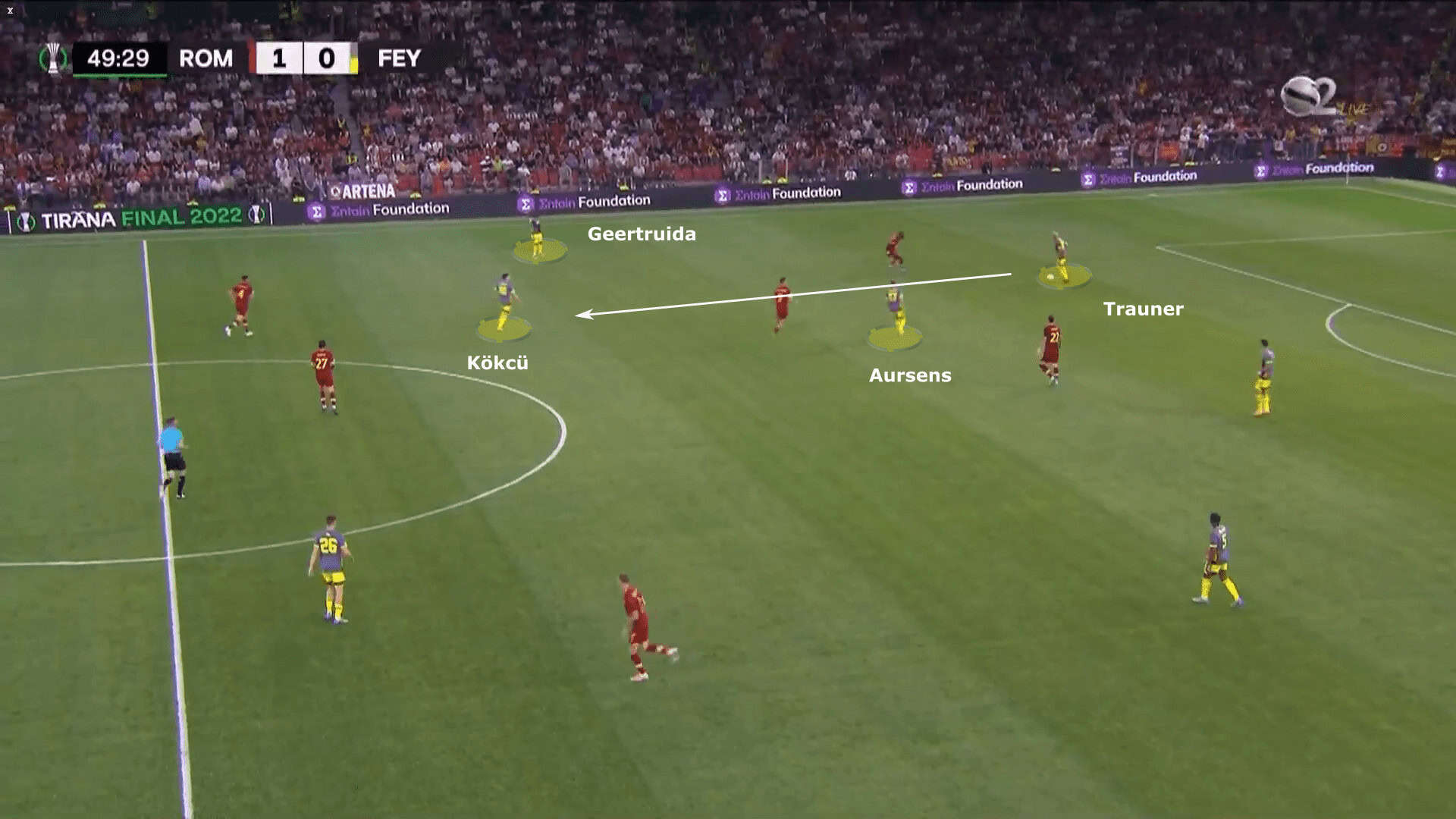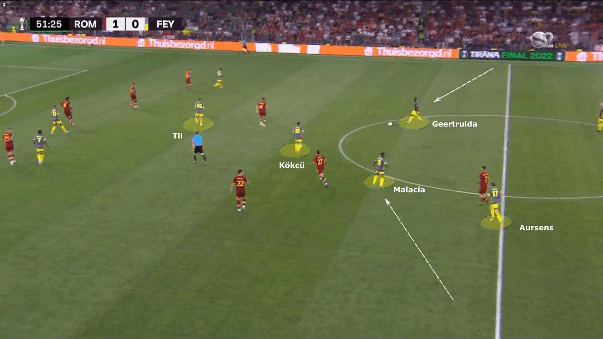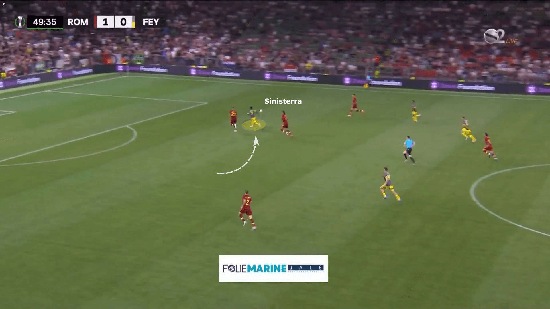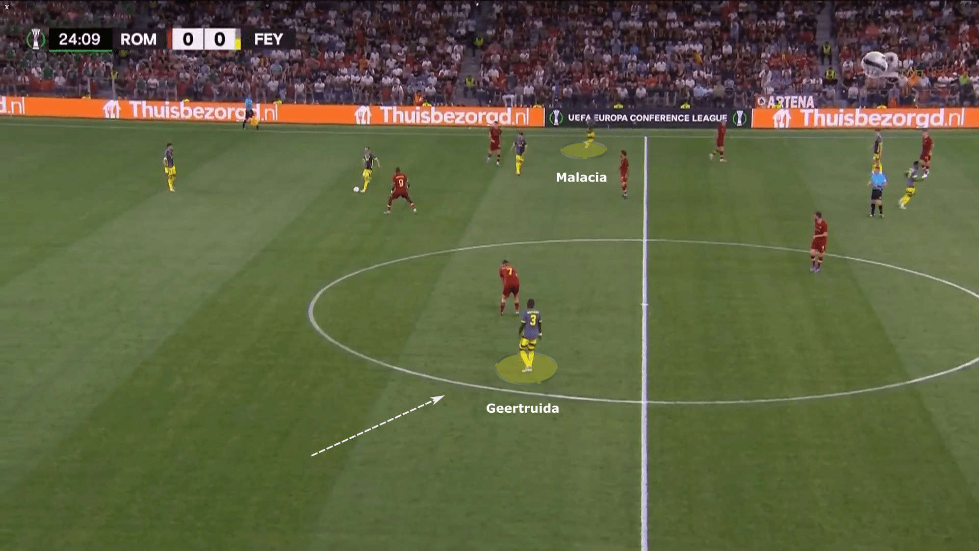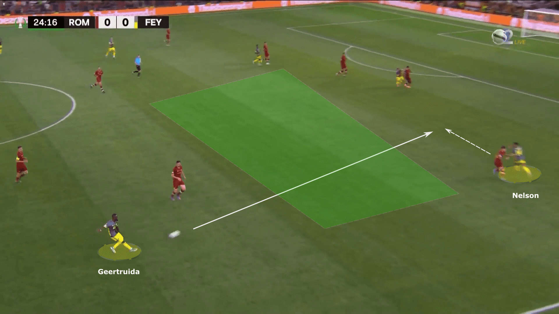 Geertruida’s positioning attracted Cristante towards him after receiving the ball while the attackers pinned Roma’s back three towards their box. This created a big gap in midfield for Nelson to exploit as he receives Geertruida’s pass on the cut-in. However, Feyenoord found it tough to create many of these openings during the first half as the Italian outfit was able to adjust.