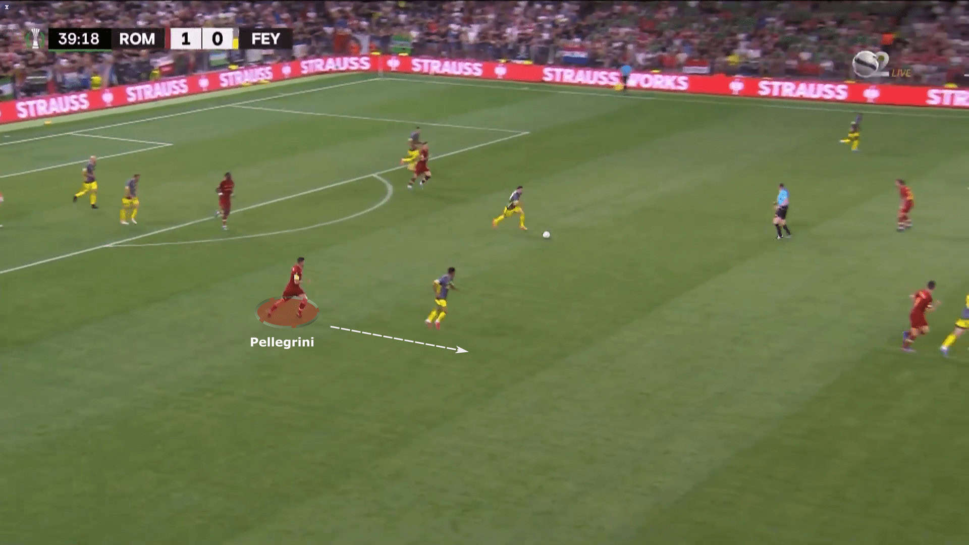 One of Roma’s main weaknesses in the semi-final against Leicester City was getting outnumbered in the middle of the park. On Wednesday night, Pellegrini tracked back to drop into midfield and support the double pivot of Cristante and Mkhitaryan/Sergio to prevent overloads. That was a key aspect of how Mourinho’s men gained control in the first half.