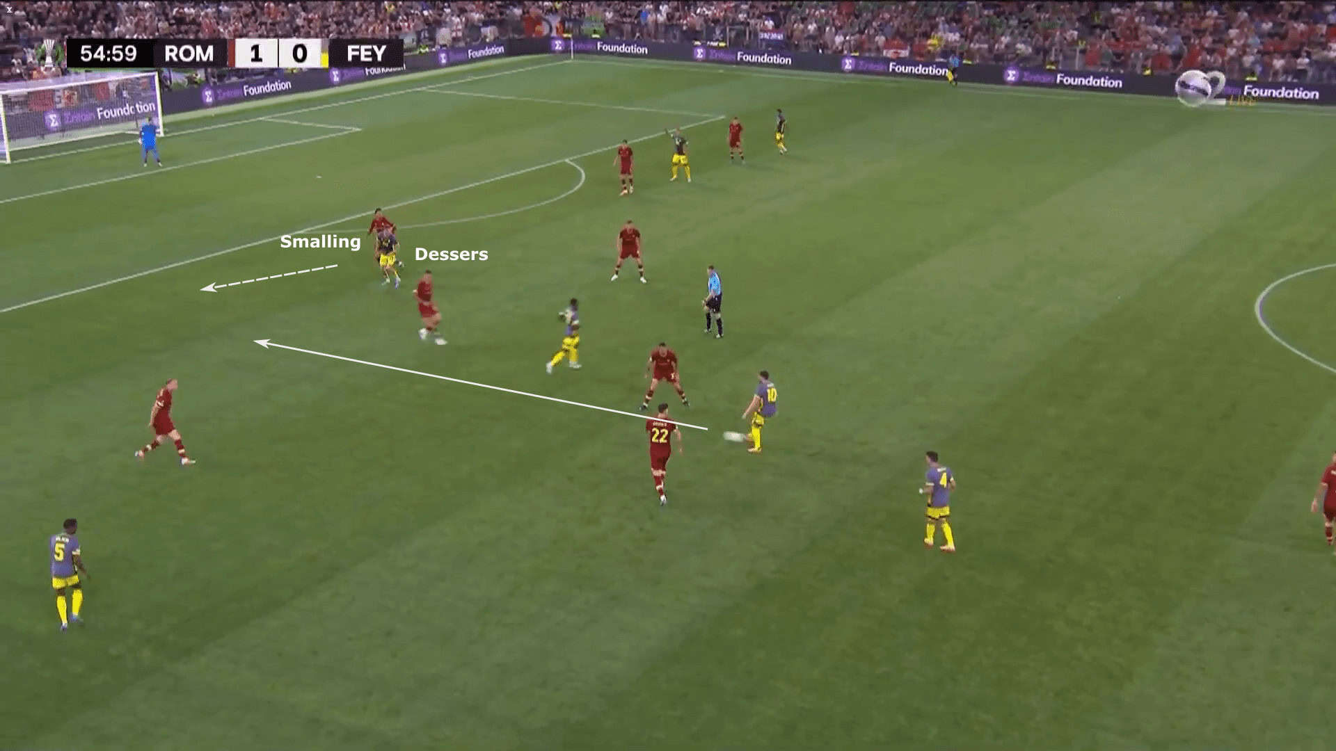 The movement of Dessers and Sinisterra, making runs between Mancini, Smalling and Ibanez stretched the pitch and afforded Feyenoord more room in midfield, while also pinning back the defensive line. The long ball into the channels was effective, as the Dutch’s side front players were able to outpace their opponents.