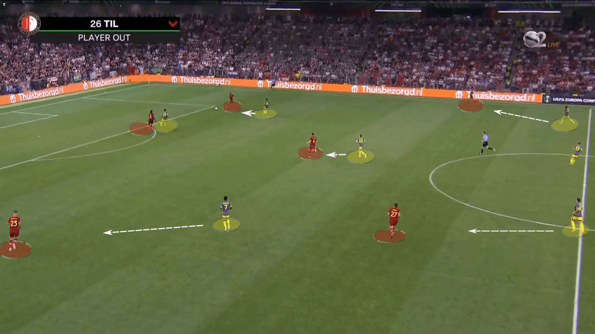 With 45 minutes left to save their season, Feyenoord returned to the pitch and proceeded to ramp up the pace. The main change was that the wings became occupied by just one player, and both full-backs began inverting and underlapping; flooding the midfield with as many as five players.