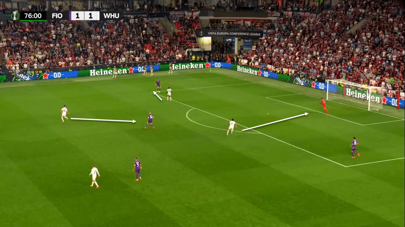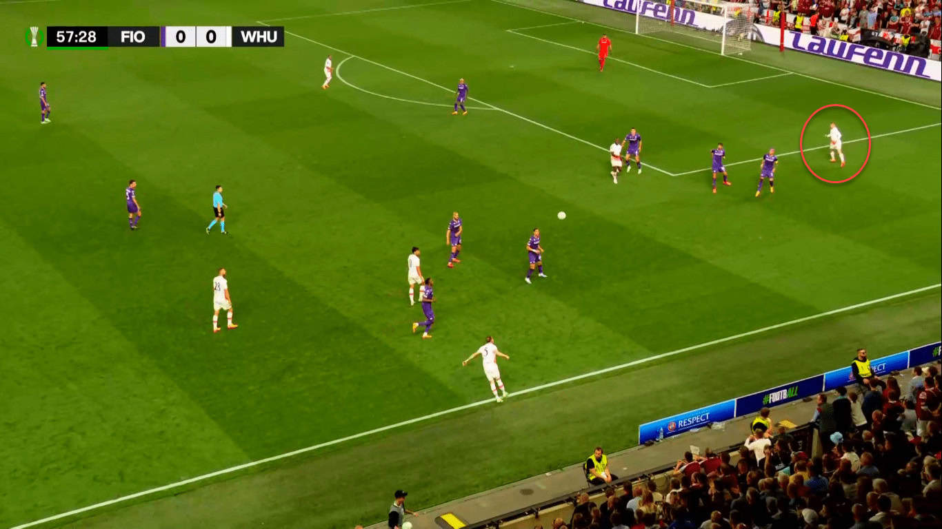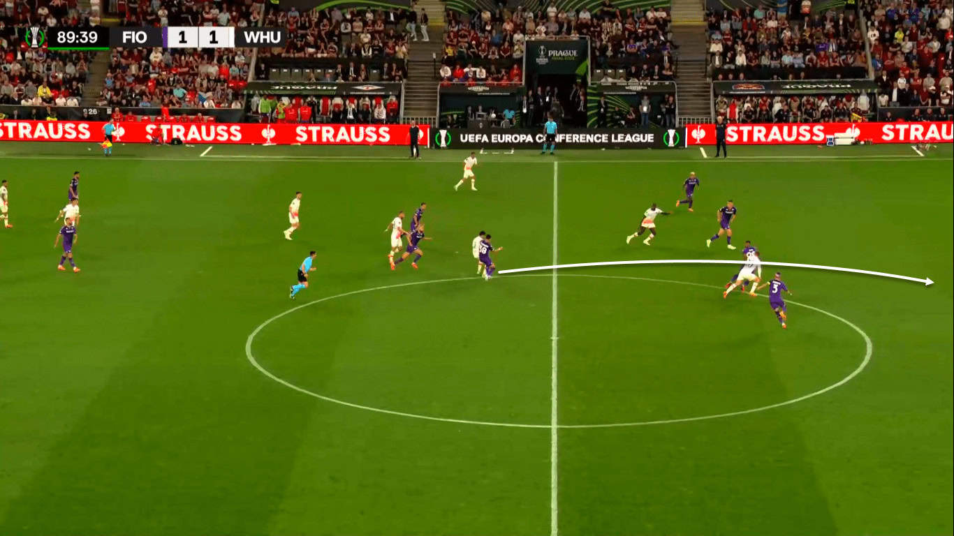 Fiorentina, however, were unable to conserve this draw at least until extra time or penalties and conceded a goal in the 90th minute which ended their dream and turned it into a nightmare. At the same time, they can only blame themselves for conceding this goal mainly because the whole action took place when Fiorentina decided to opt for an extremely high defensive block during that time in the match, and as soon as they lost the ball, a single through pass and a movement from Bowen were sufficient to put the latter in a one vs one situation with Terracciano.