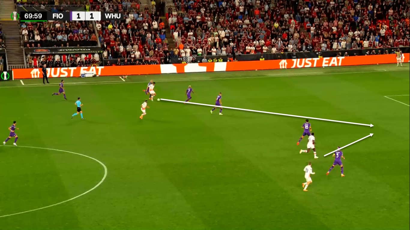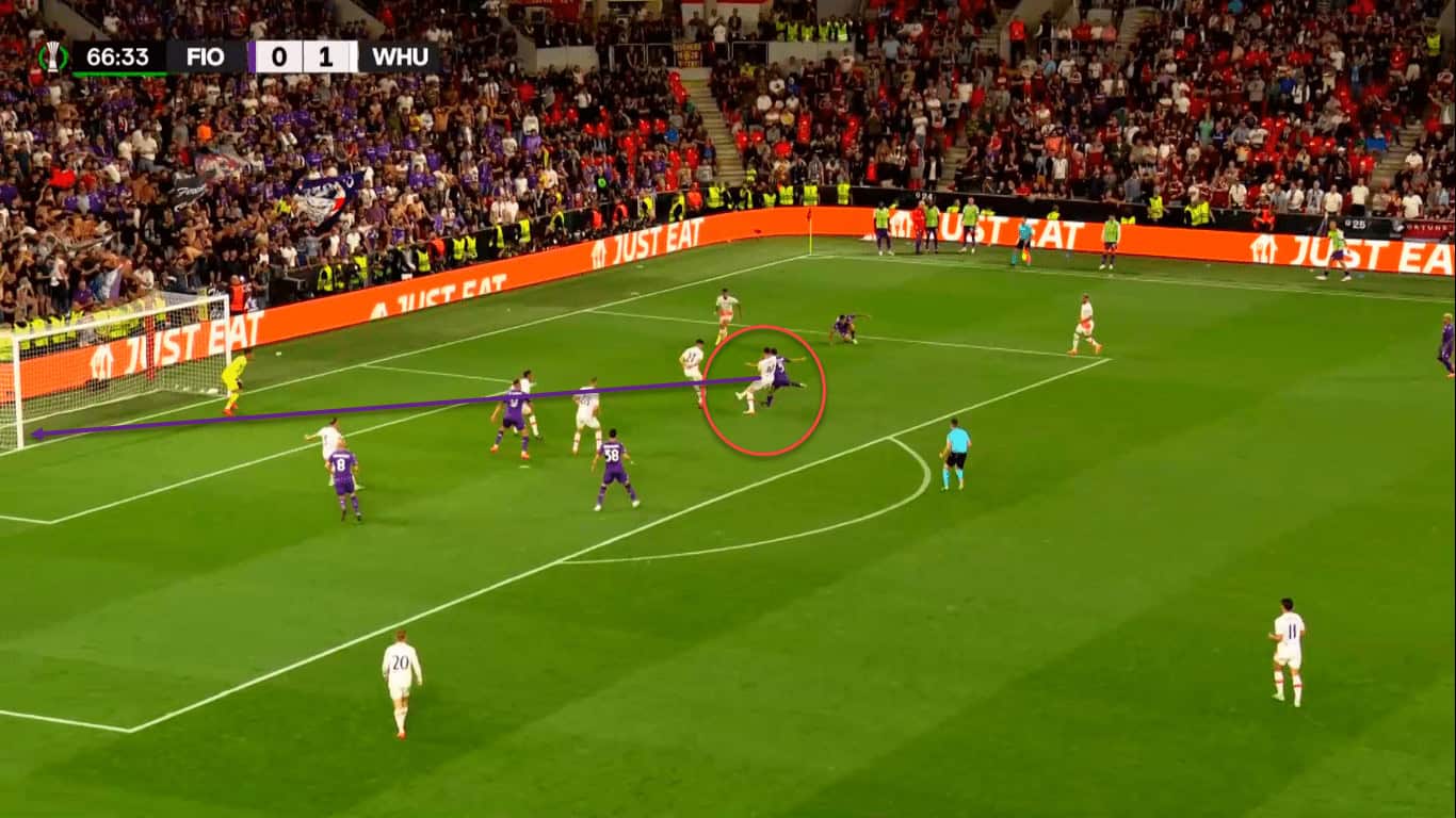 Fiorentina were able to rally themselves together after conceding the goal and kept pushing for an equaliser despite not being able to reach West Ham’s goal with the needed frequency. Yet, Amrabat was key in initiating the team’s attacks from the back using very accurate crosses and through passes towards both wings.