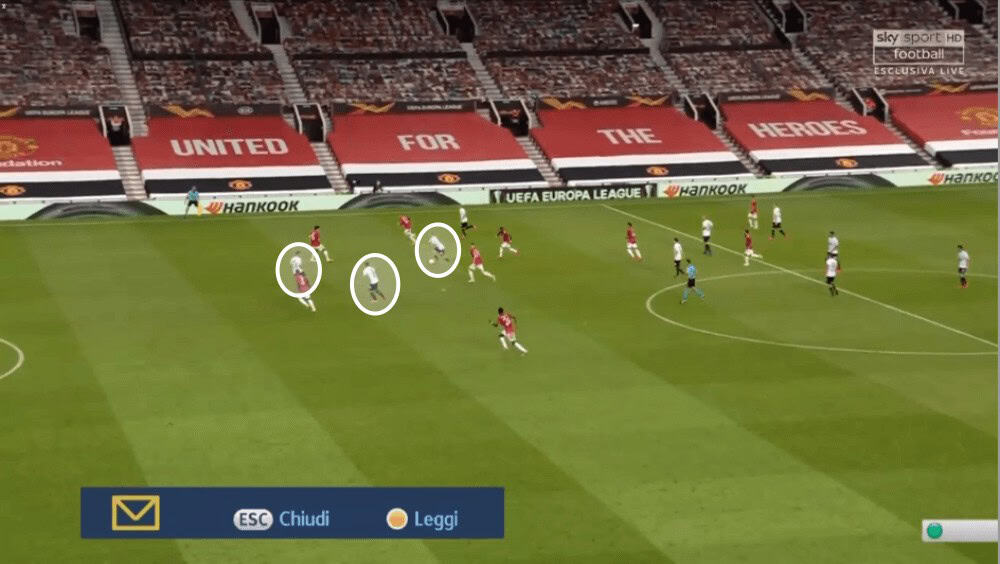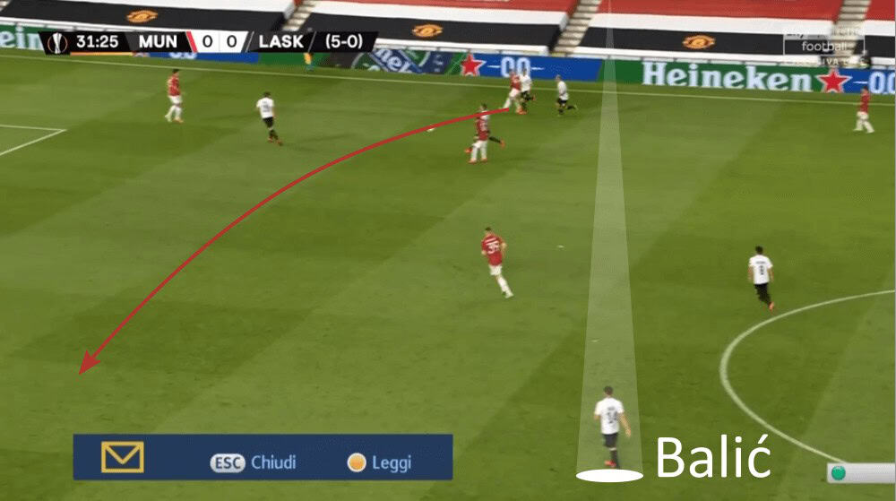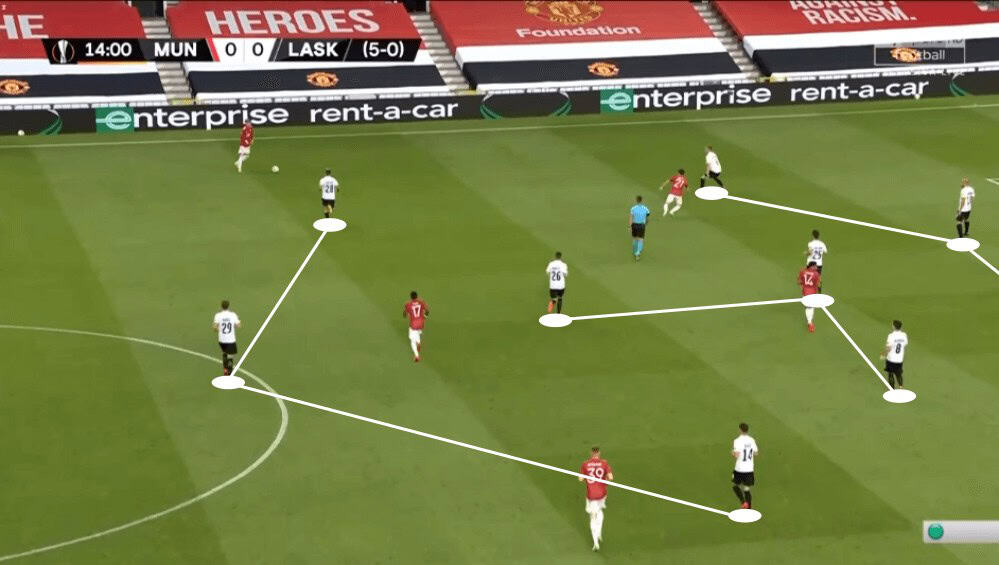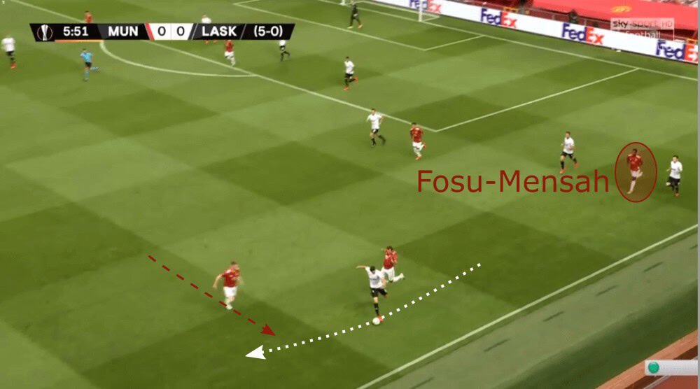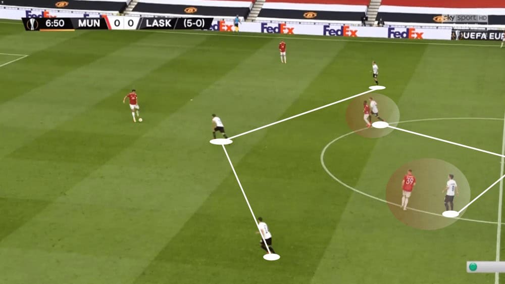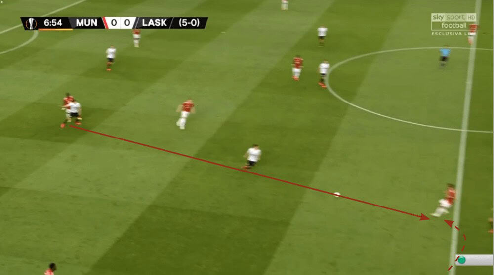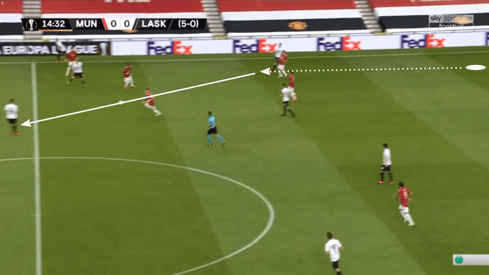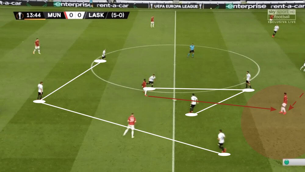 Even though the press of LASK Linz looked at the beginning very promising, United then found several ways to bypass it as we have seen now. To conclude, they used dynamic movements or the dropping of Fred to create passing lanes to keep the ball for a sequence of passes to then find Williams on the left who then would have a lot of space.