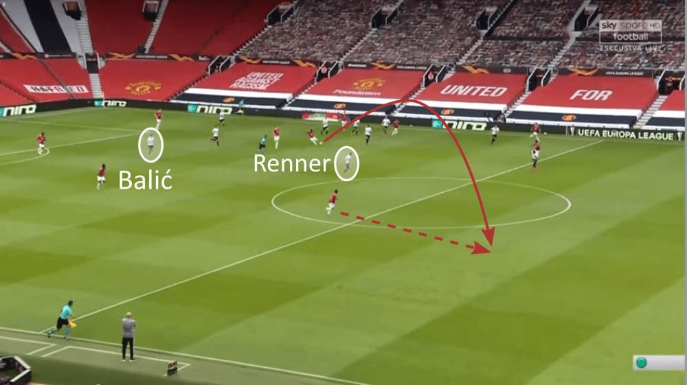 However, another aspect of LASK Linz’s press helped them massively: the whole team of Thalhammer worked together during the press what is very important when you put pressure on the opposition that high up the pitch. However, this logically opened up space for the Red Devils elsewhere on the pitch and this was especially on their right side the case due to the high positioning of Renner and the fact that Renner and Balić shifted over to the other side very aggressively. Below, we can see a situation in which Manchester United exploited exactly that.