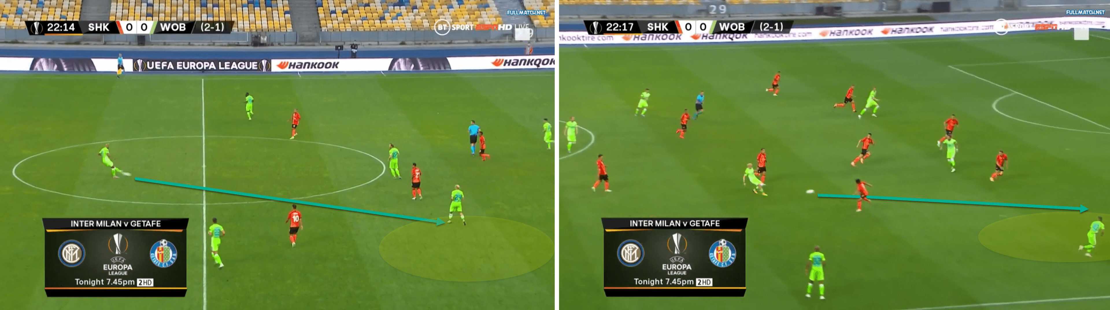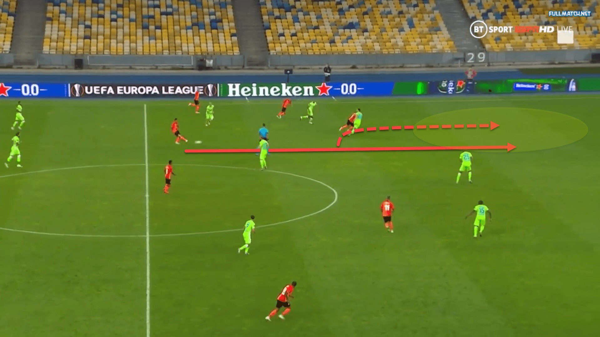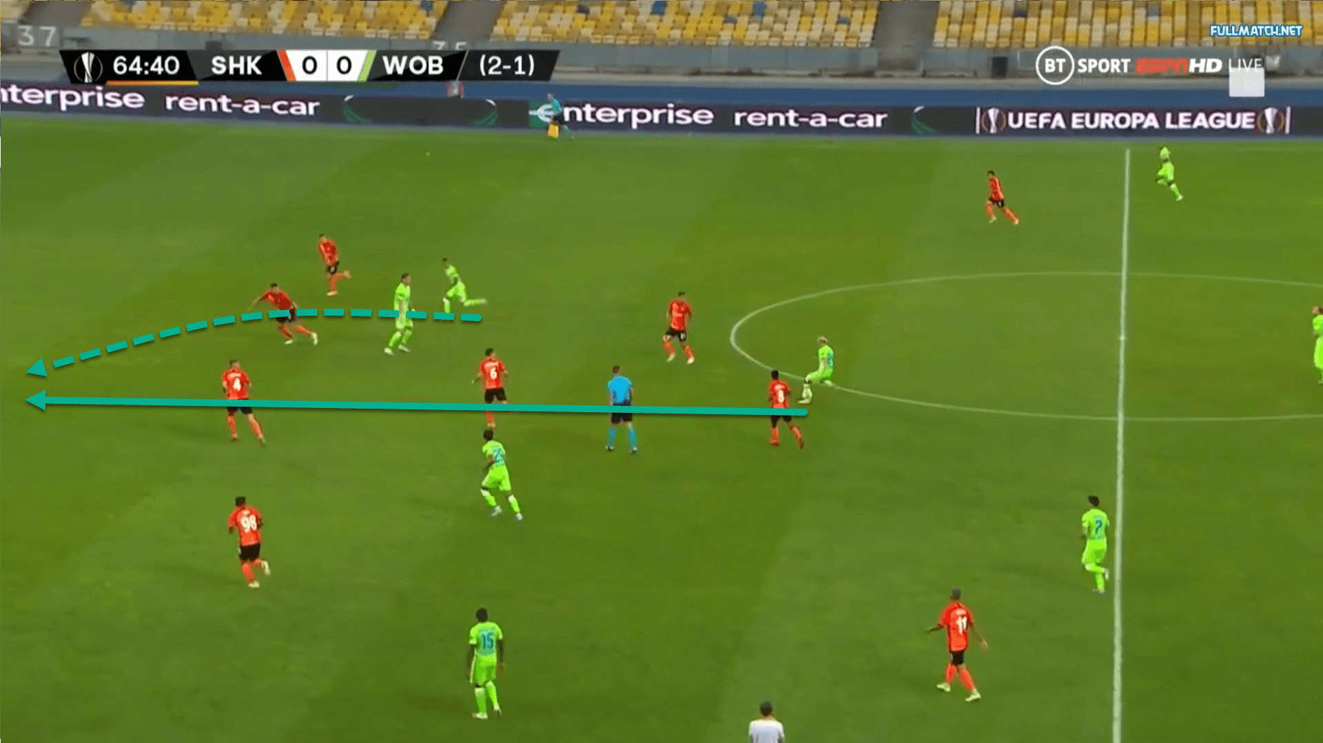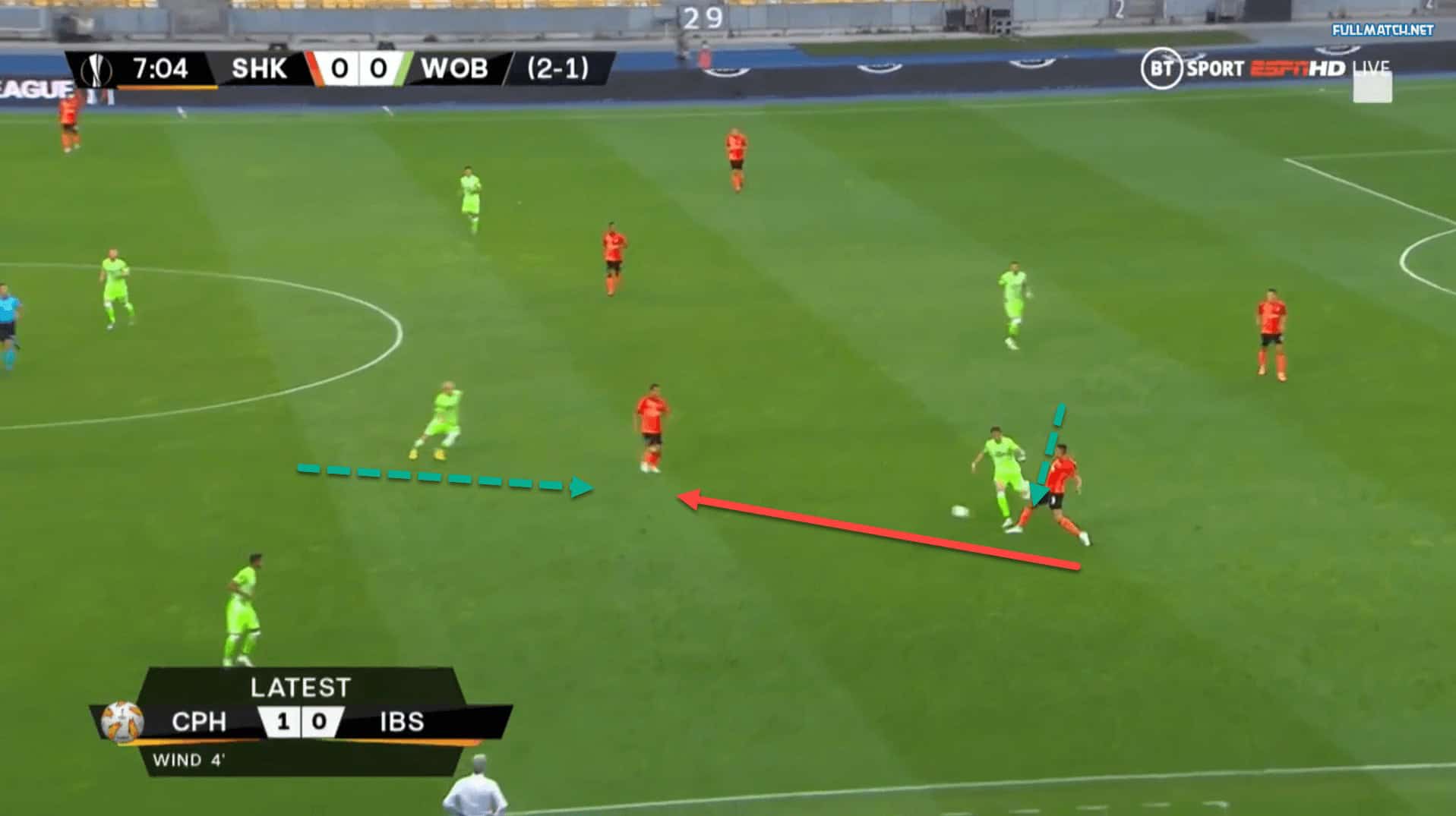 With the players that Shakhtar have in attack, they were always going to cause Wolfsburg problems. Ultimately, their ability and link-up is how they opened the scoring in the 87th minute. The Shakhtar forward players looked to play quick passes into areas of space, which were usually created by the dribble of the player on the ball.