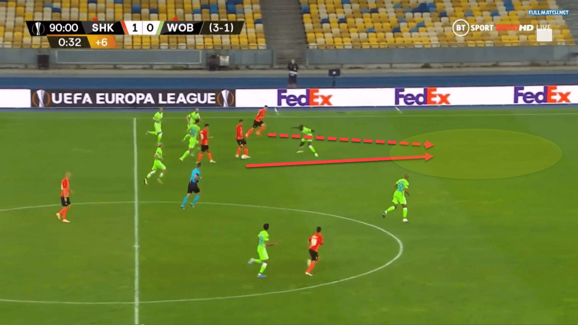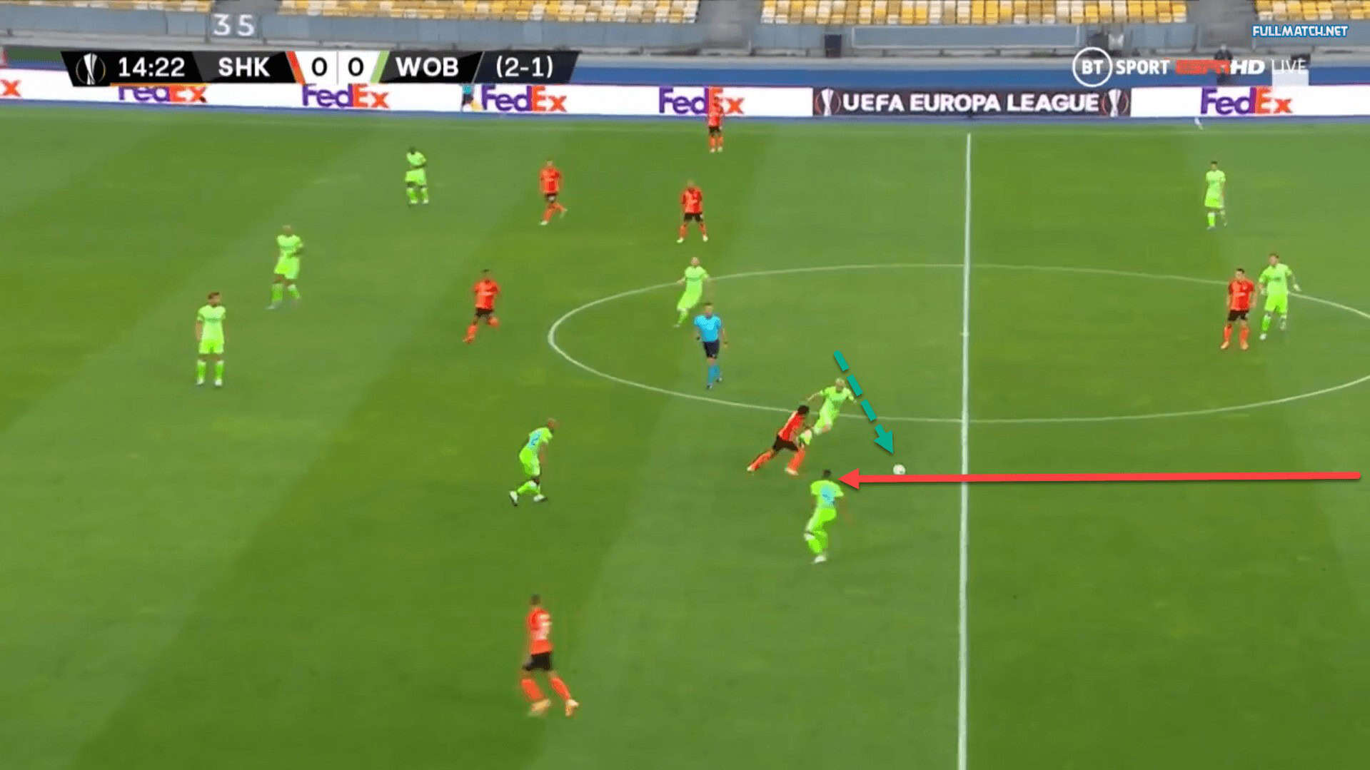In the build-up to the first goal shown above, we can see the problems that the skilful Solomon causes Wolfsburg in the wide area. Three Wolfsburg players get dragged into the wide area, this creates space for Dodô to receive the ball and he crosses into Moraes, who scores the opening goal and secures the win for Shakhtar Donetsk. The dribbling in the wide area from Solomon was important in creating space in the build-up for this goal.