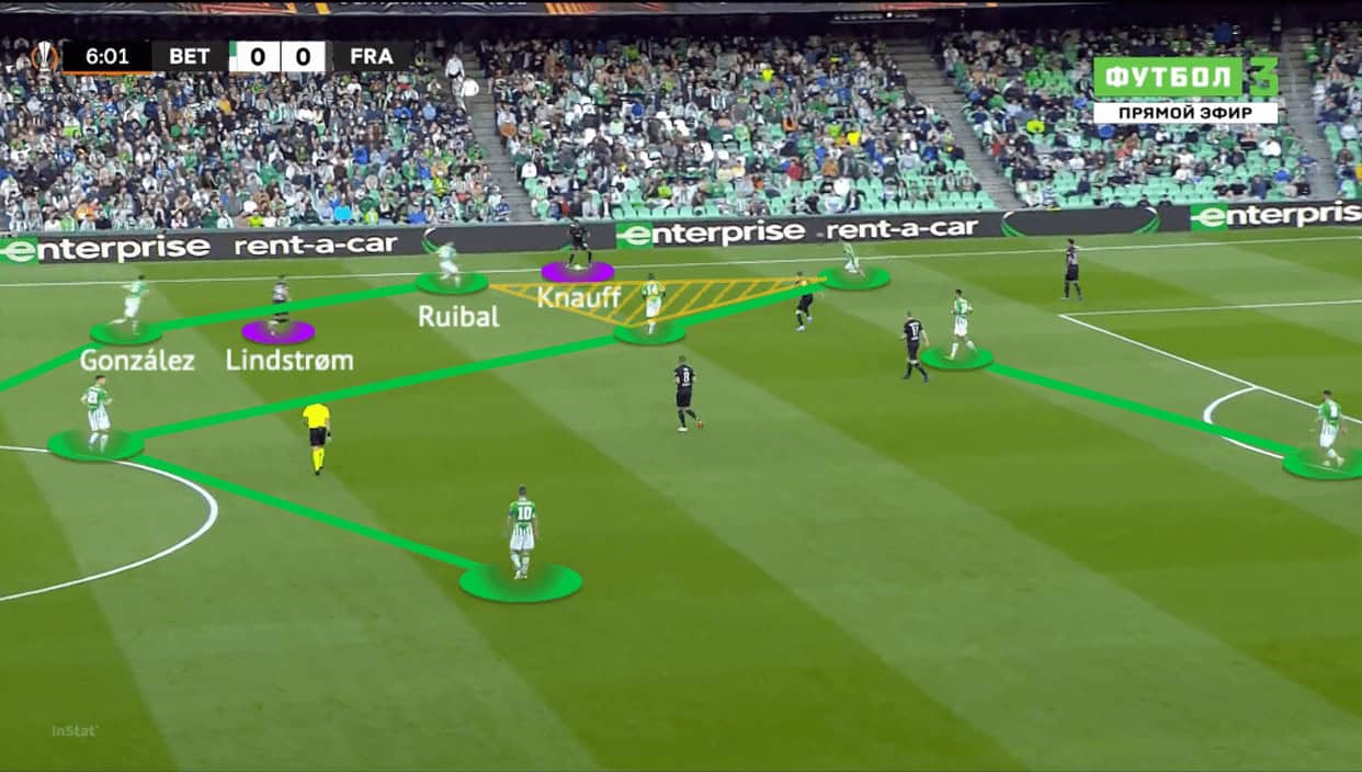 Mainly because the Frankfurt 10s were in the half-spaces, Betis were without a clear and specific solution to deal with these players. It was a 4v2 in the midfield, and Betis were unable to close the central spaces since having both 10 and 6 gave Frankfurt a more staggered structure in the constructions.