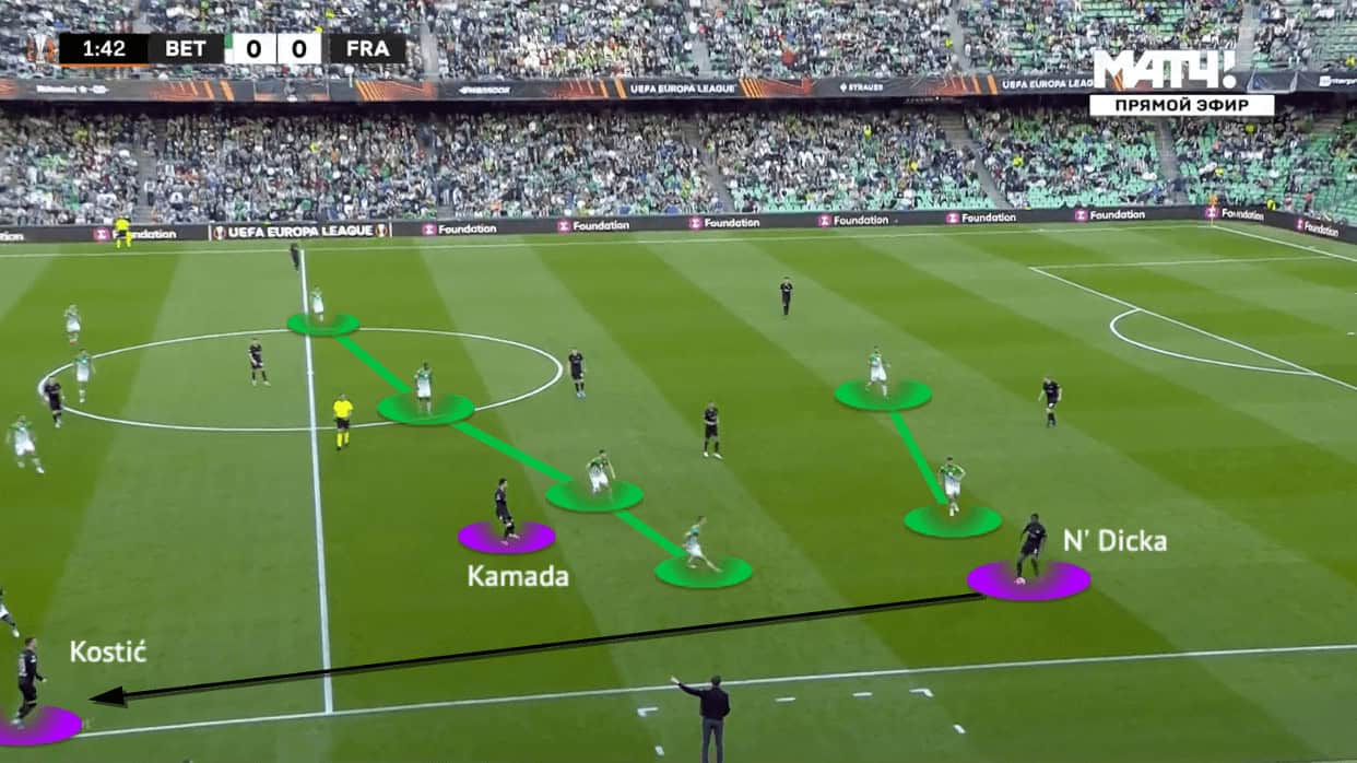 In the midfield, as Kamada dropped very deep to the half-spaces behind the second line, his presence attracted the attention of the Betis midfielder and winger. While both Betis players were trying to cover him in the half-spaces, their defensive actions were limited – Canales could not press N’Dicka or cover the passing lane to Kostić out wide.