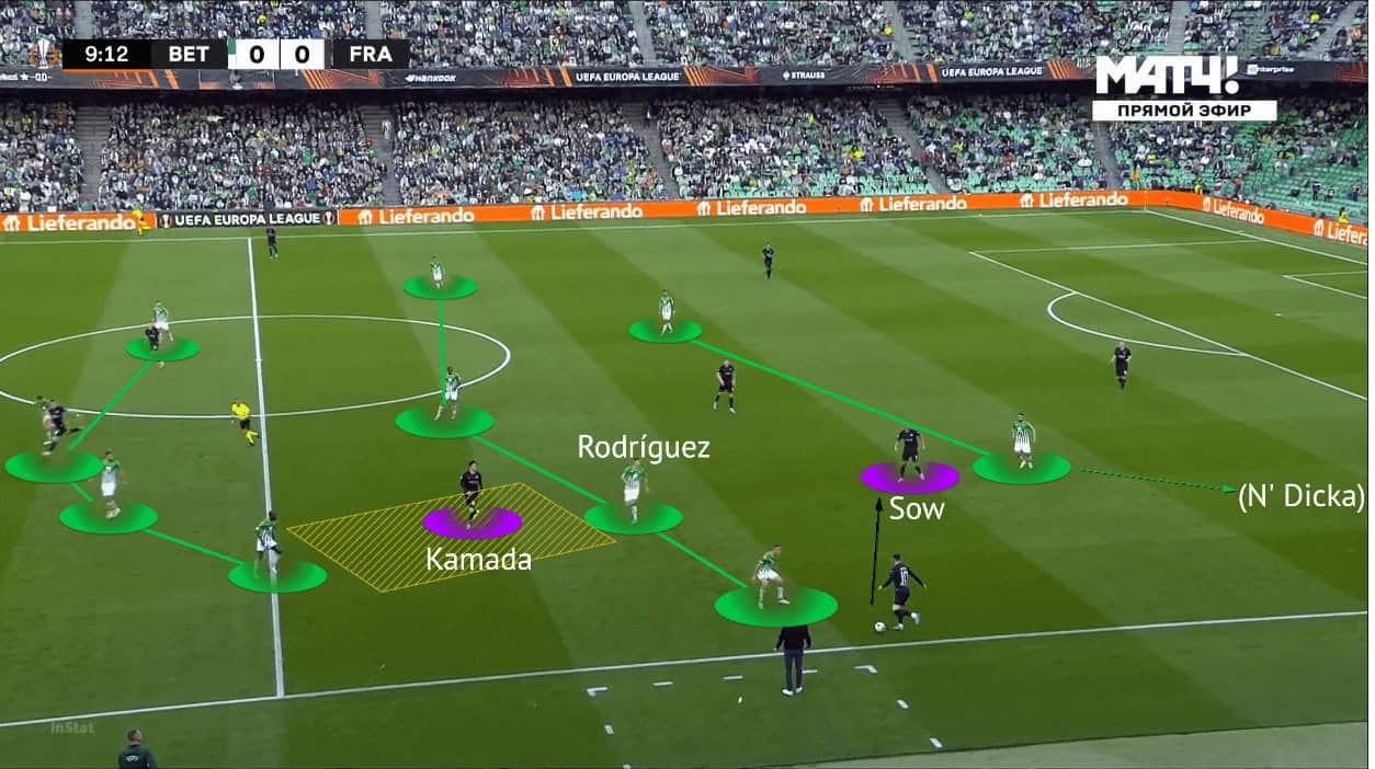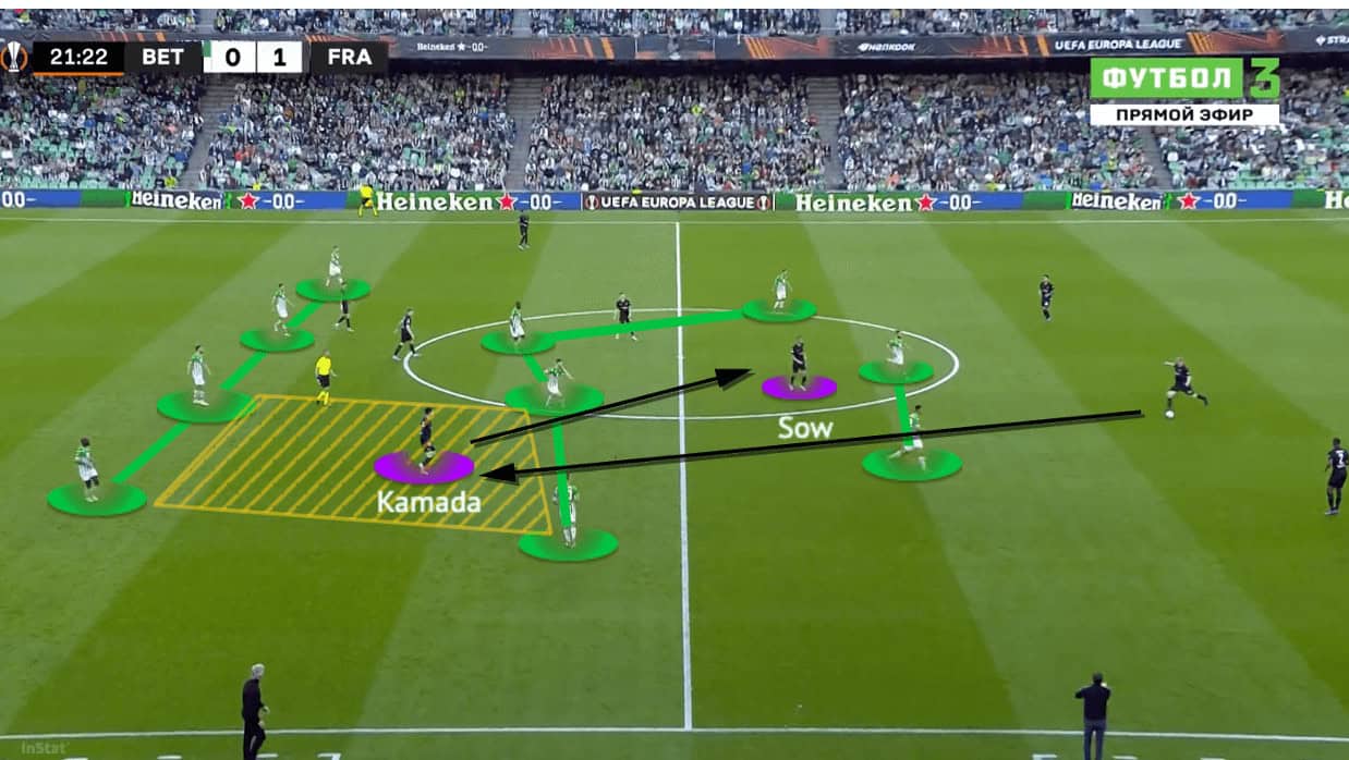 The above image reflects another scene of Kamada’s involvement without touching the ball. He stayed in the yellow zone to occupy both Sabaly and Rodríguez simultaneously, as a result, Betis could not close Sow in the centre because their midfielder was dragged away by the Frankfurt 10. With N’Dicka, the centre-back, to offer enough depth in the first third, that also dragged away the striker to create enough spaces in the centre for Frankfurt to attack. That’s why Kostić could use Sow as a solution to transport the ball to the weaker side of the defence.