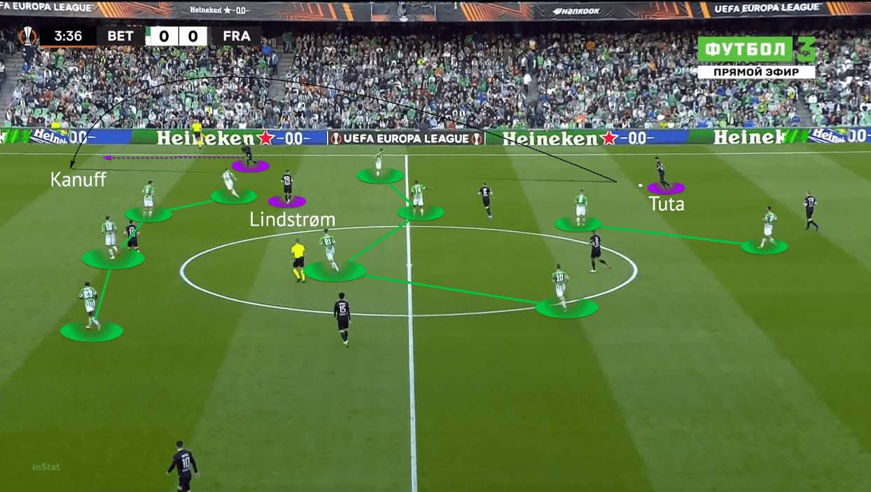 In the first line, Betis only had two players, while Frankfurt had three, it was obvious that the third centre-backs could always be the free player to pass. In this game, the wide centre-backs, Tuta and N’Dicka were progressing plays mostly, as we have shown in the above image.