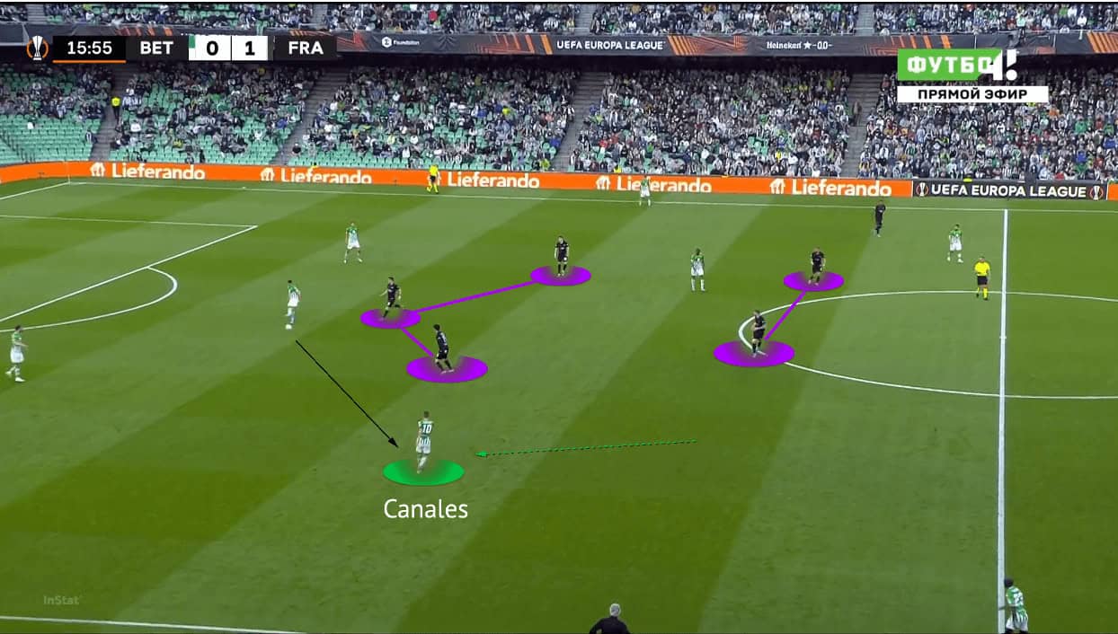 When Betis played a back three, their best solution was usually Canales as the former Real Madrid man was a “false-winger” – a type of player that Pellegrini liked to use. When he dropped from the right-winger position to the midfield, he became an extra man to receive outside of the Frankfurt formation, as shown above, then he could turn and face the opposition goal.