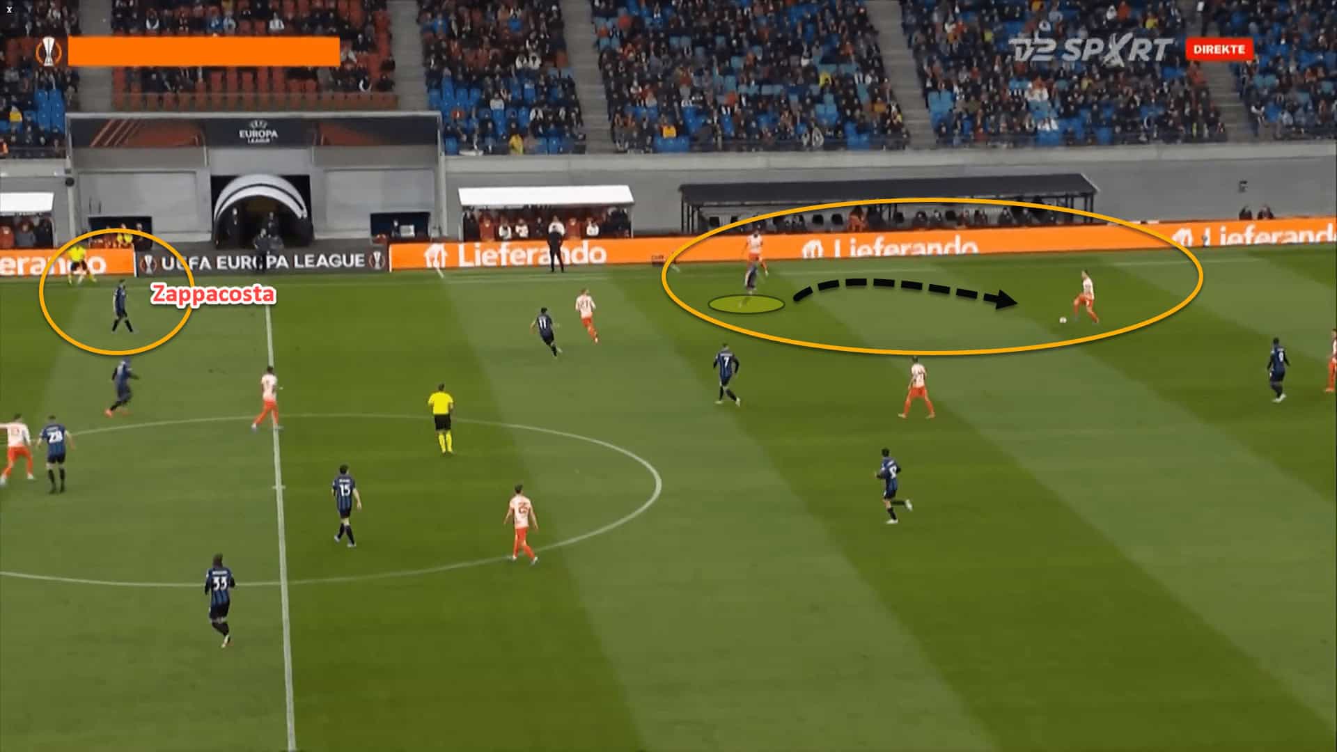 However, Gasperini was smart. Once more, the switch to the 4-2-3-1 worked wonders tactically for them. When situations like this arose, Atalanta were able to go 2v1 in the channels chasing the balls in behind because Zappacosta was staying back.