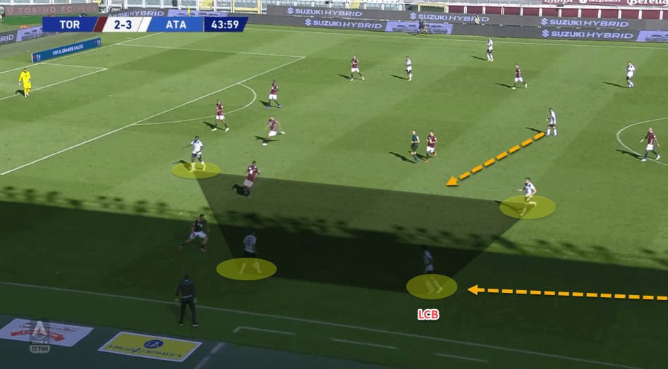 Atalanta pushed the fullbacks higher and dropped the nearest pivot player across for the overloads. In doing so, the opposite fullback tucked inside and created a temporary back three alongside the two centre-backs.