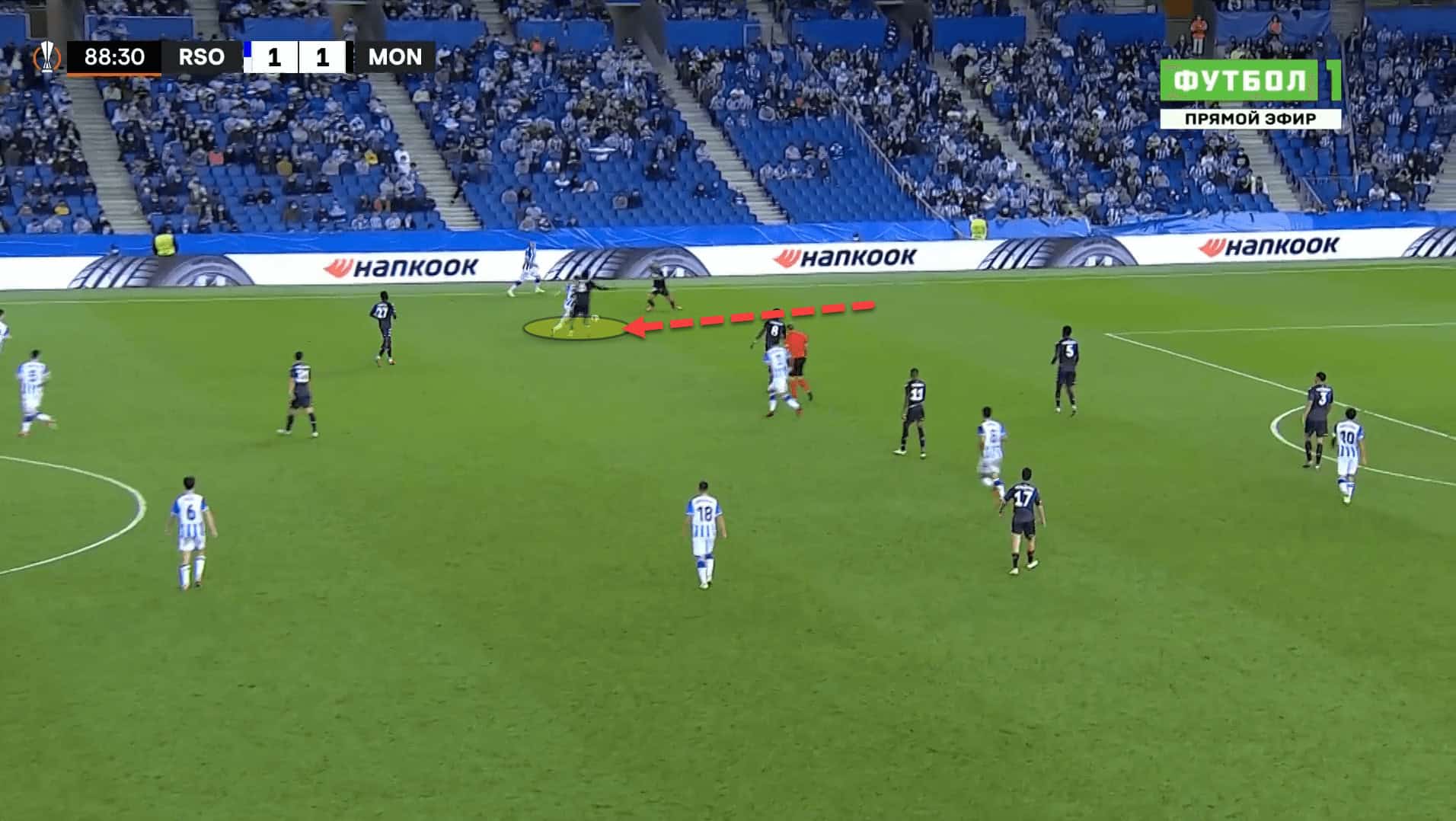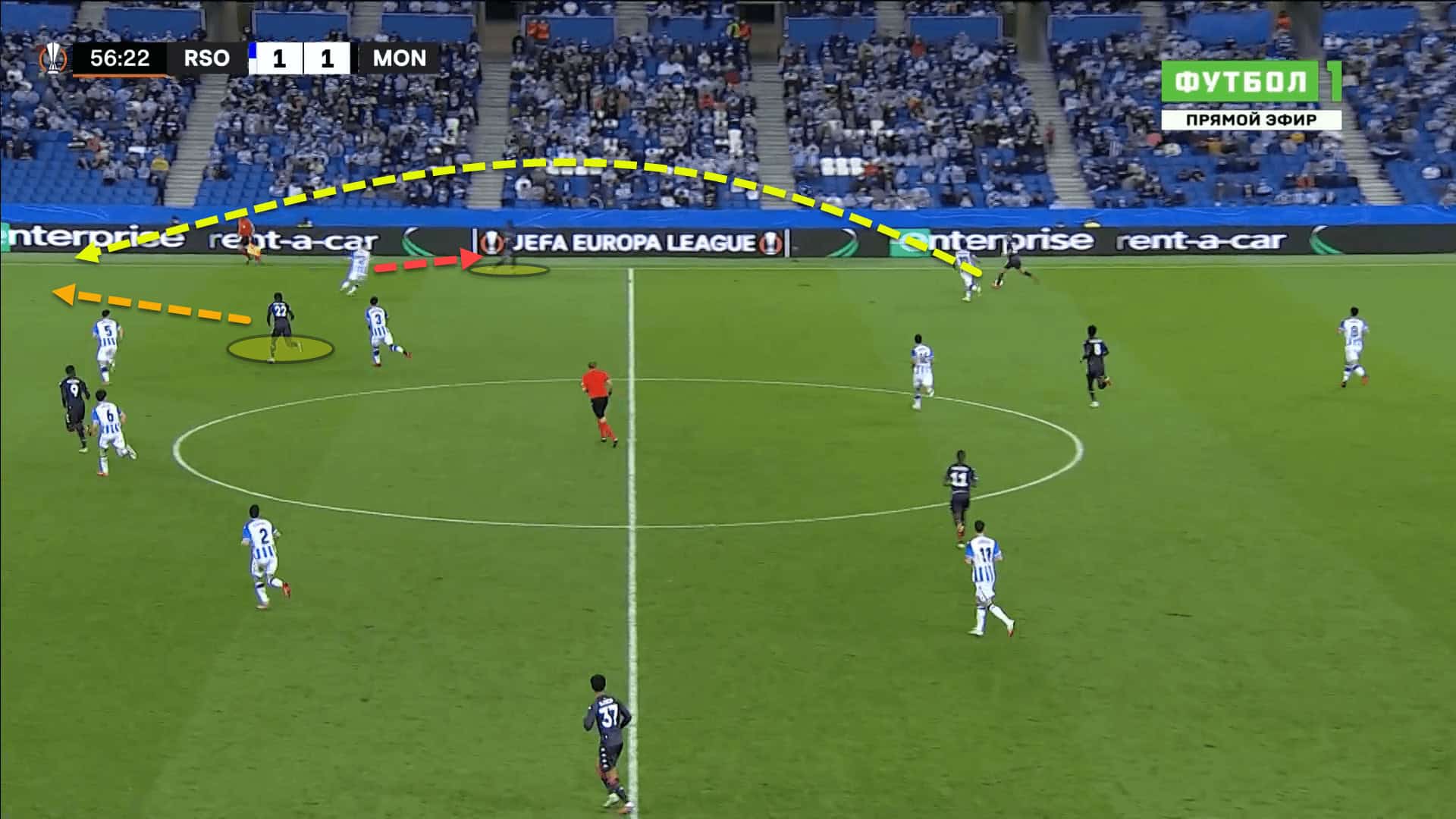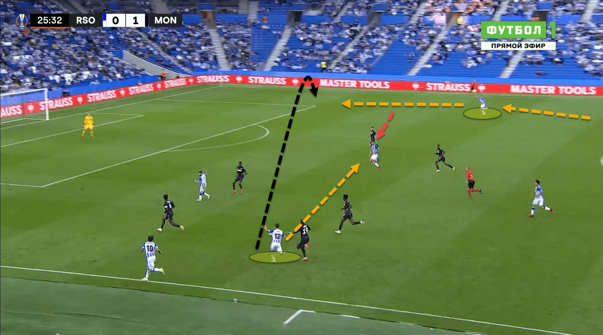 Early in the first half, situations like this occurred more than once from Real Sociedad’s press and put Monaco under real pressure as they were losing possession in very dangerous areas of the pitch in their own half.
