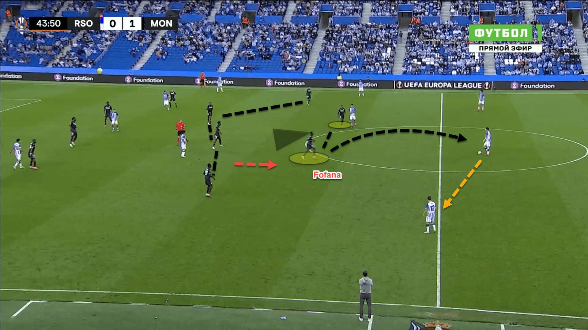 Fofana constantly made runs in behind Real Sociedad’s backline too despite playing in midfield. The 22-year-old was essentially playing as a second striker in this European tie when Monaco had possession of the ball