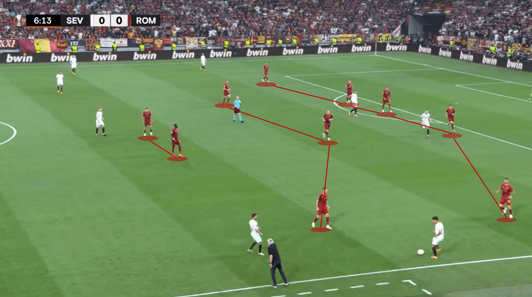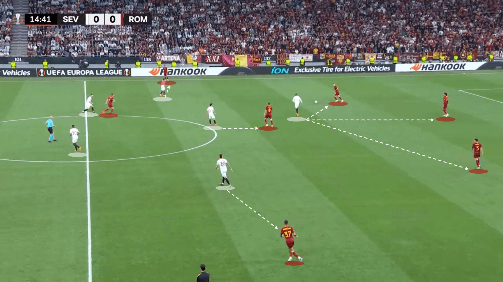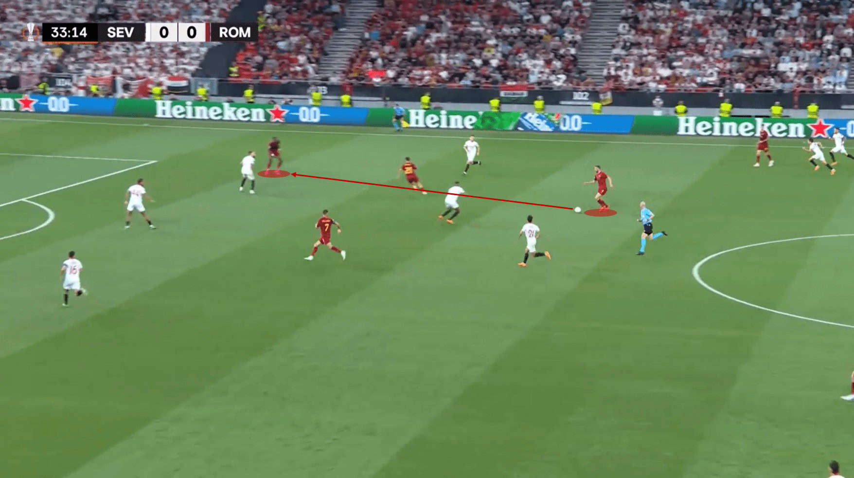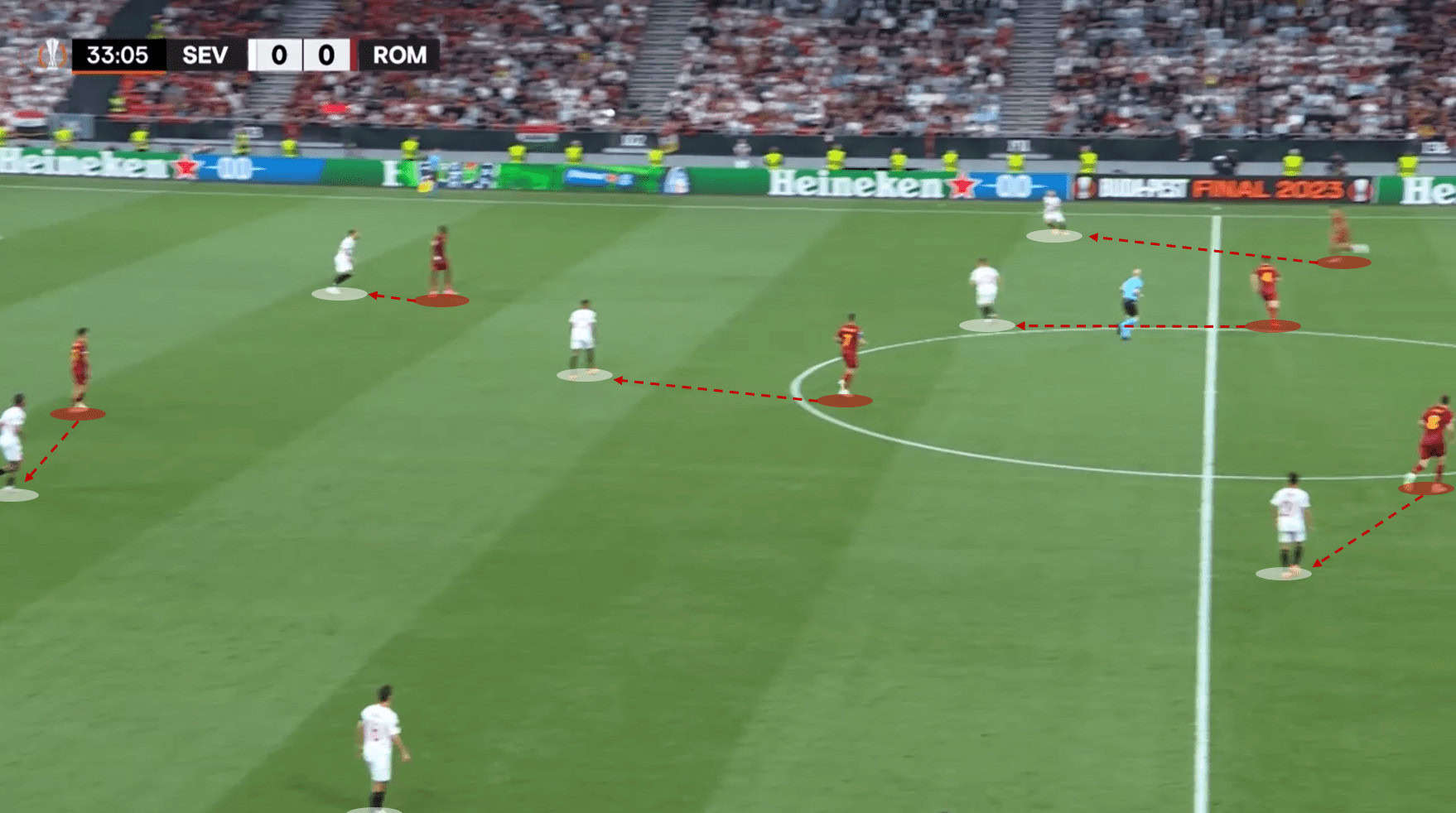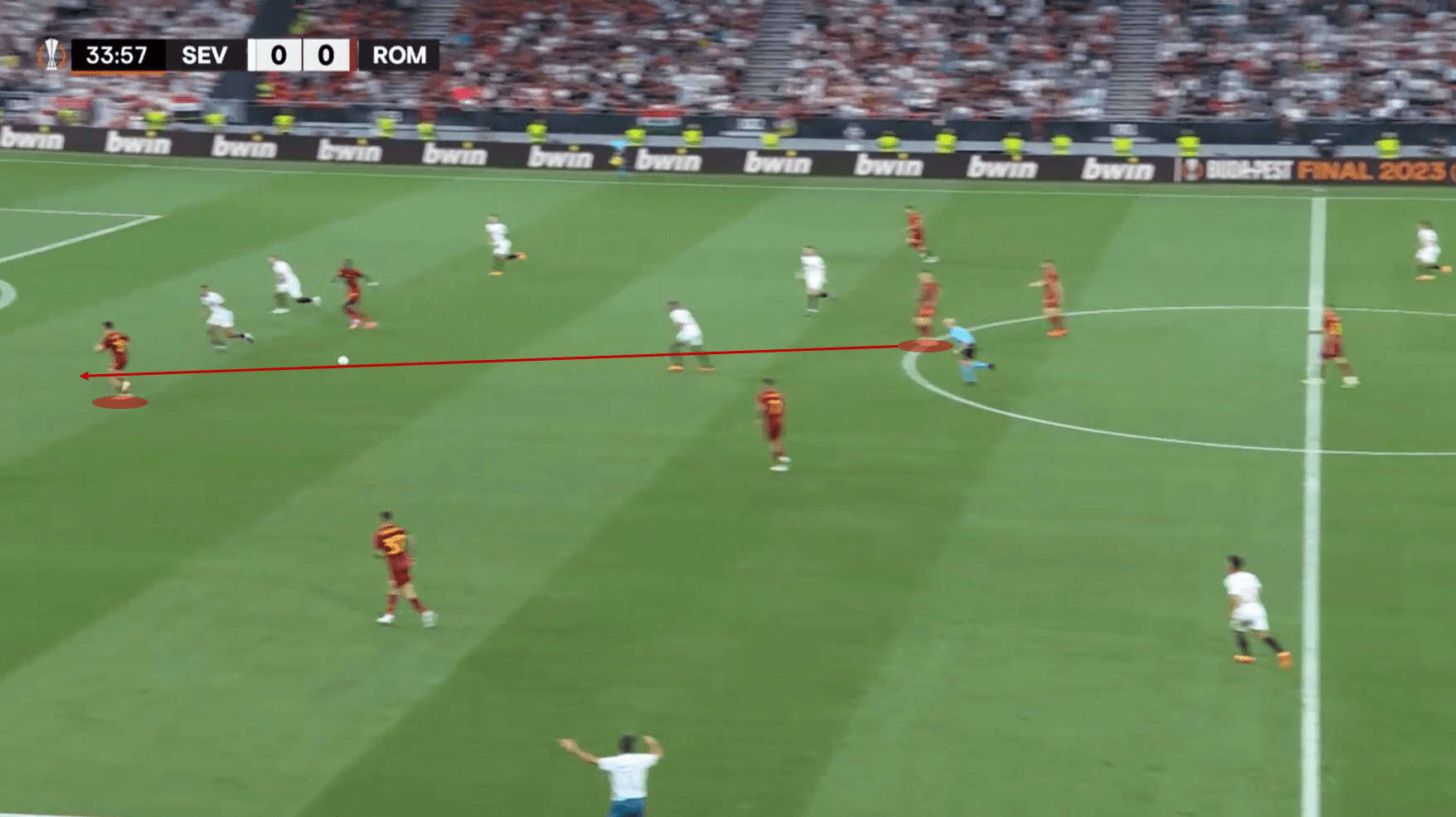 This meant that, in theory, Sevilla wouldn’t have any spare players during build-up to make it more difficult for them to progress the ball safely through the thirds. Sevilla would then have to play more long balls, which are riskier as it reduces the chances of maintaining possession. If Roma could then win these duels from the long balls, they could then win possession back. This would both prevent Sevilla attacks whilst also looking to initiate attacks of their own.