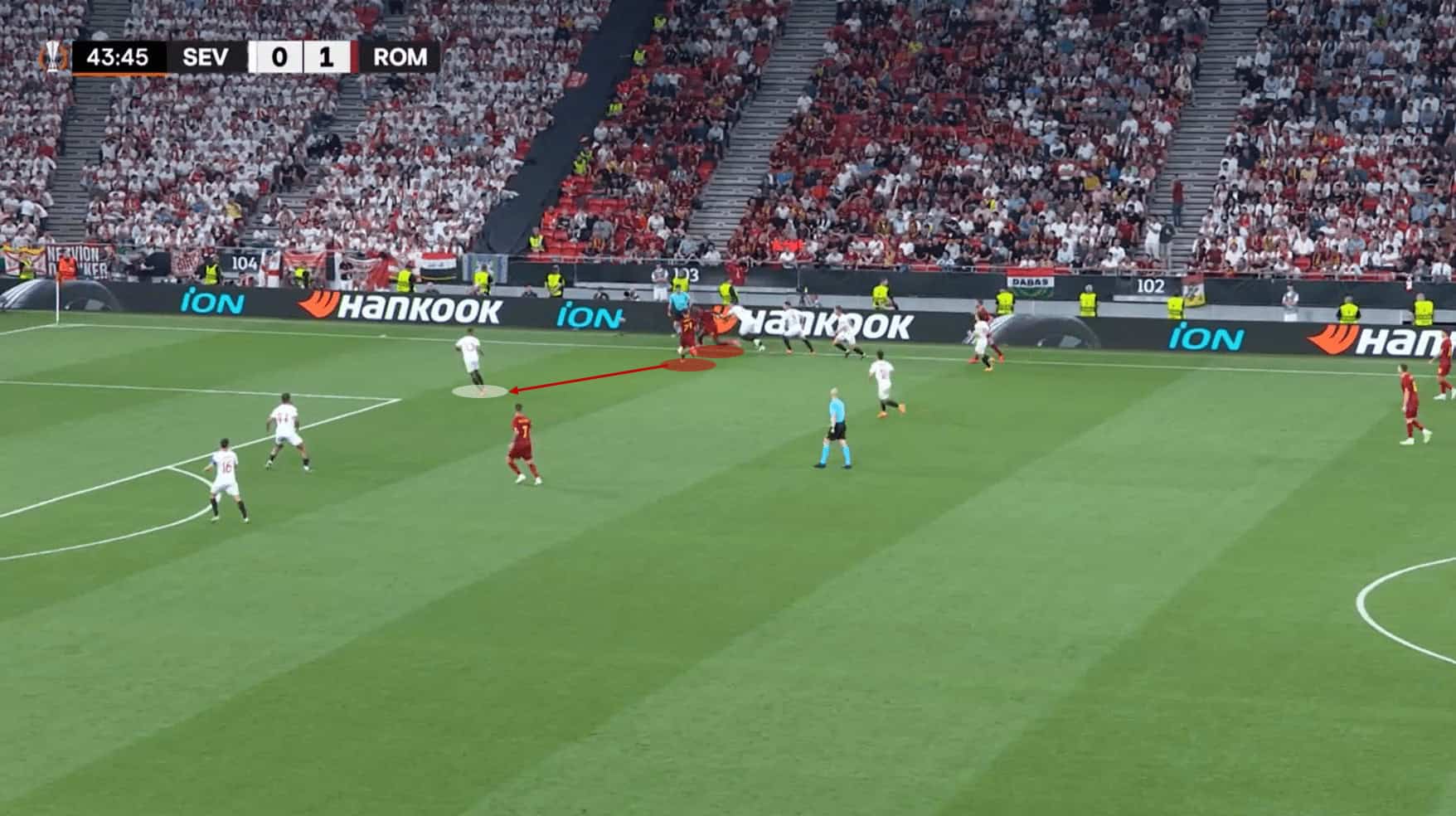 In the instance of the above example, Sevilla did just that. The ball was played long from goalkeeper Bounou towards left-back Telles. Roma managed to win possession back before progressing play towards Abraham (see below).