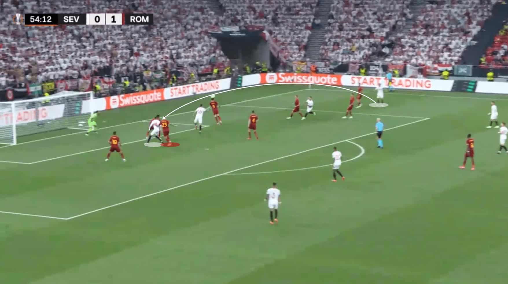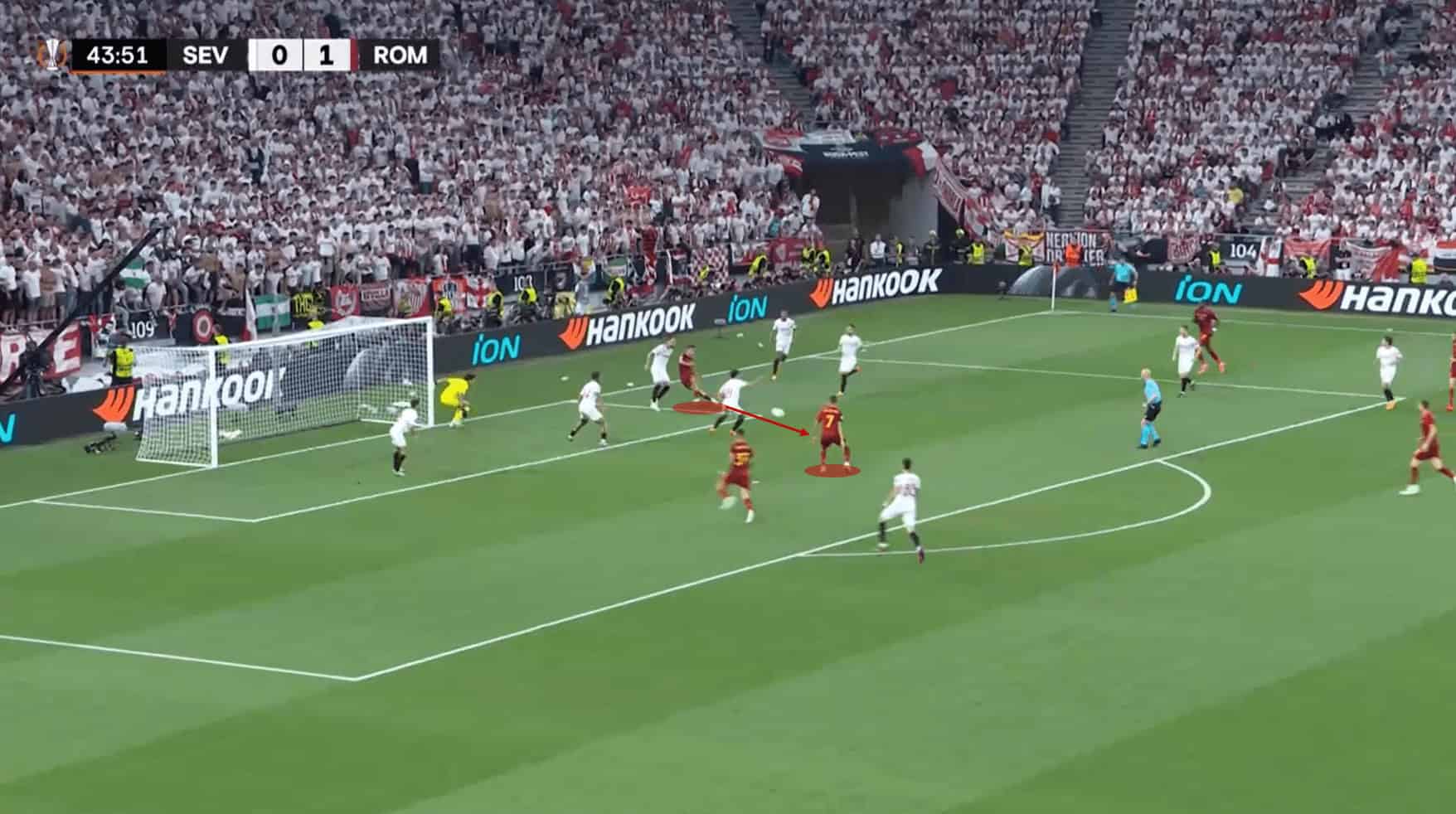 In this final example below, Sevilla have possession on their right side. We can see how Roma are defending very deep with eight outfield players level with their penalty area. Navas crosses the ball from the right side into the penalty area between the defence and goalkeeper. We can see that Sevilla striker En-Nesyri is goal side of Roma’s Mancini. The defender then had to move towards his goal in an attempt to cut out the cross but the cross actually deflected off of Mancini and into his own net, levelling the score shortly after halftime.