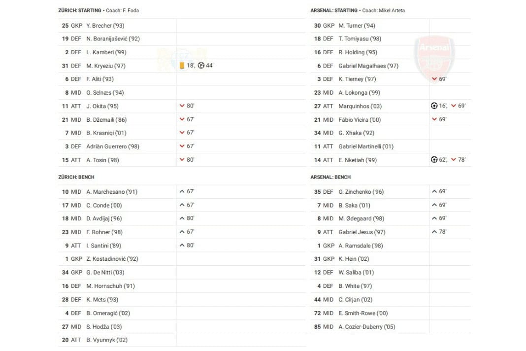 Thursday evening saw Zurich vs Arsenal in the UEFA Europa League.