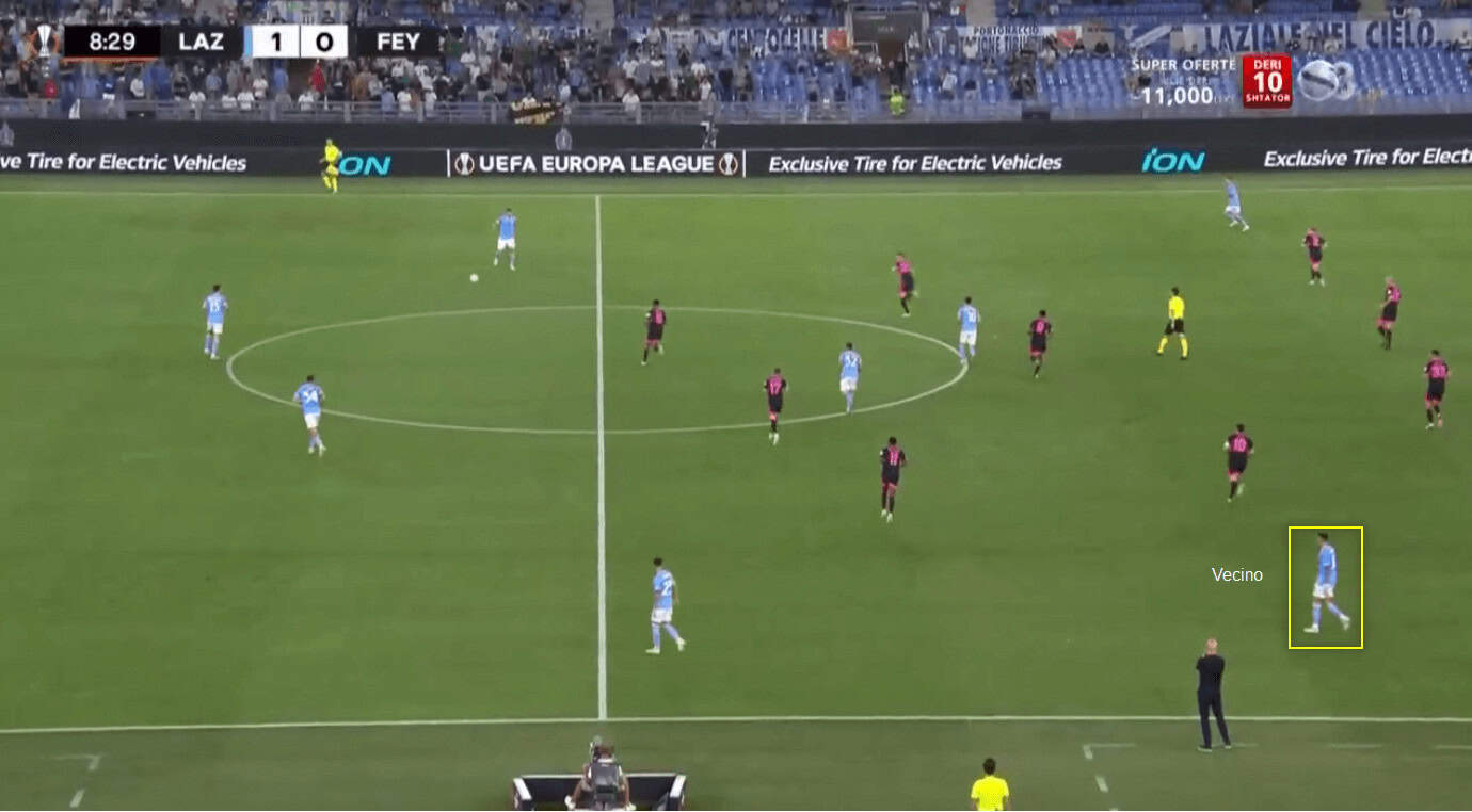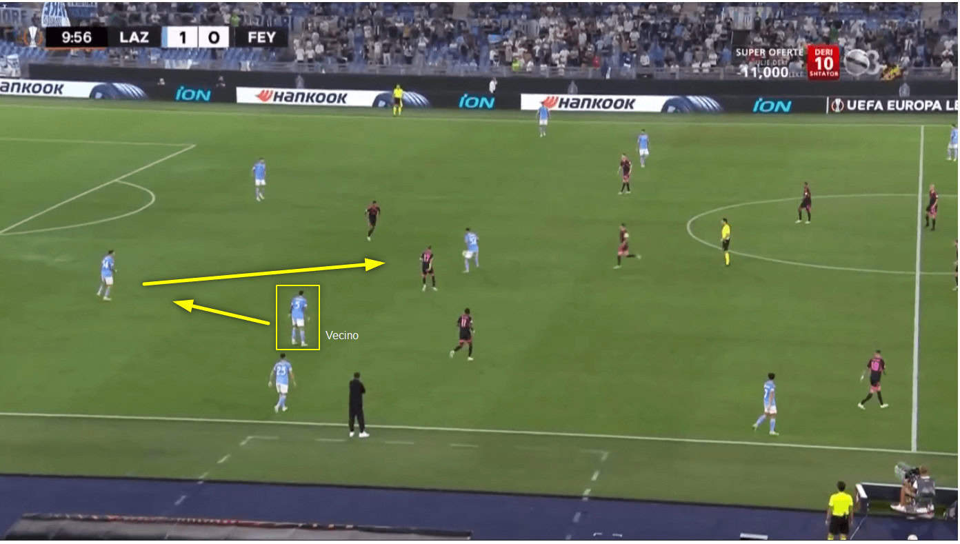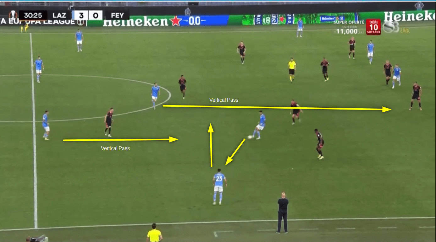 Lazio kept creating space and gaps in Feyenoord’s defensive shape by following each horizontal pass or backwards pass with a forward pass.
