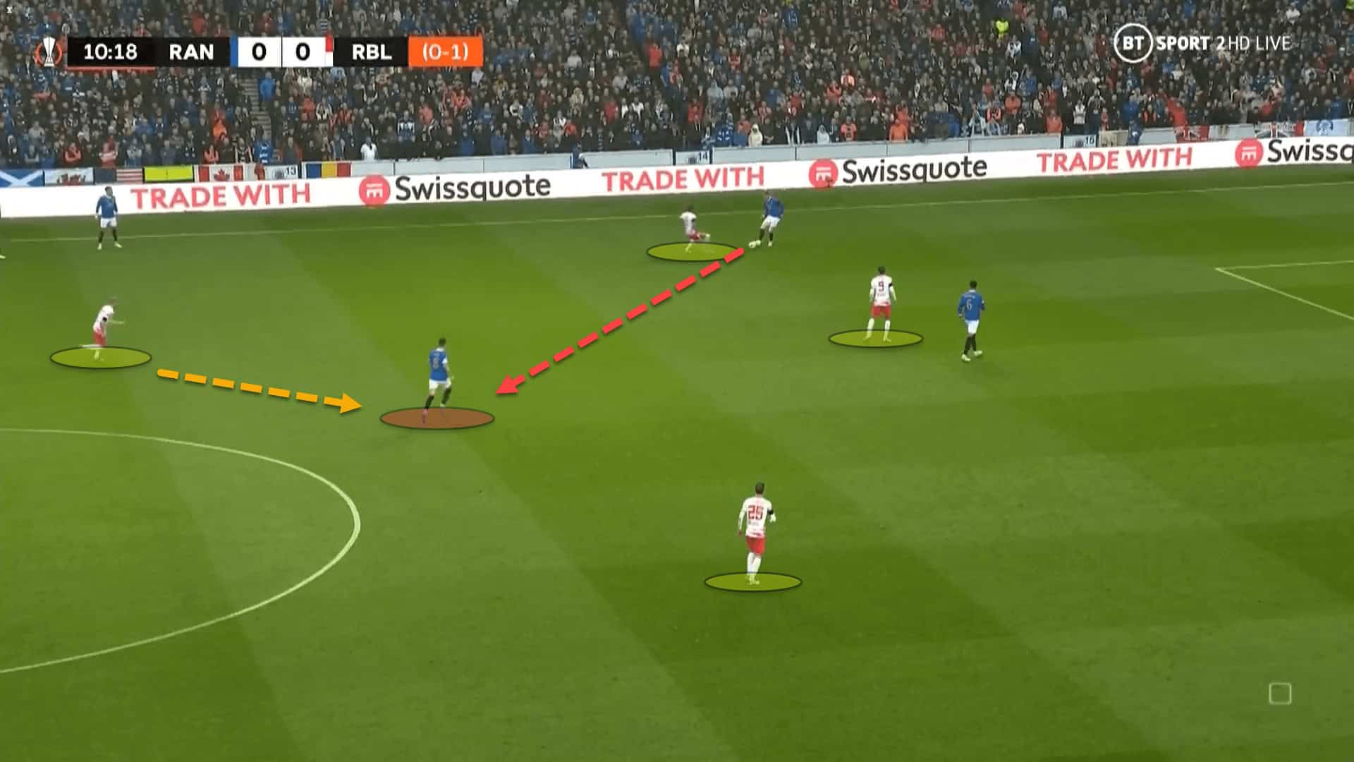 Leipzig’s approach did work. Tedesco’s men were successfully able to negate Rangers from playing into Jack or Kamara, forcing the Scottish side to look for different routes to progress the ball up the pitch.