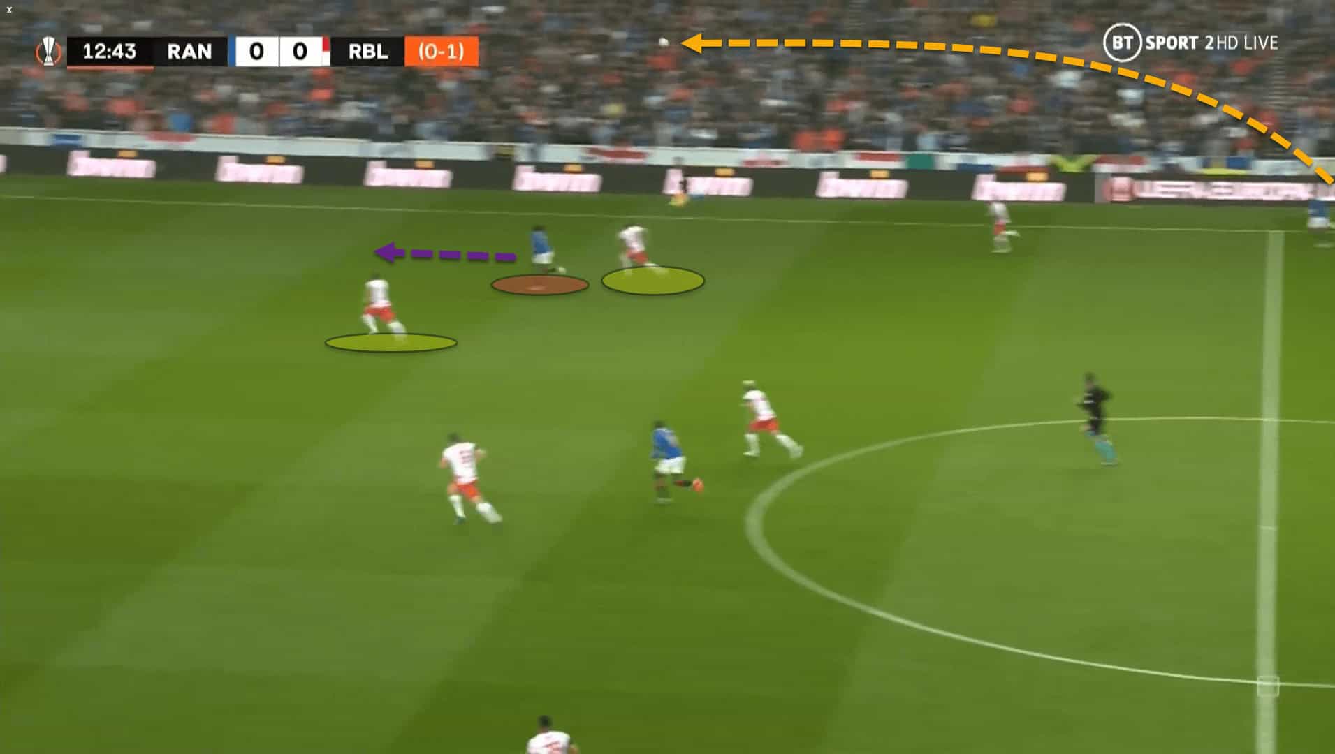 By having the front three block off the passing lanes into the space behind them, Leipzig’s two central midfielders, Kevin Kampl and Konrad Laimer, could focus solely on picking up any of the Rangers forwards that dropped deeper, or following them into the channels if they made runs in behind.