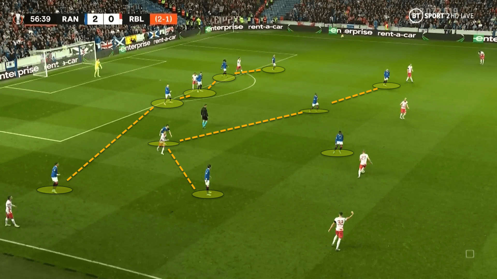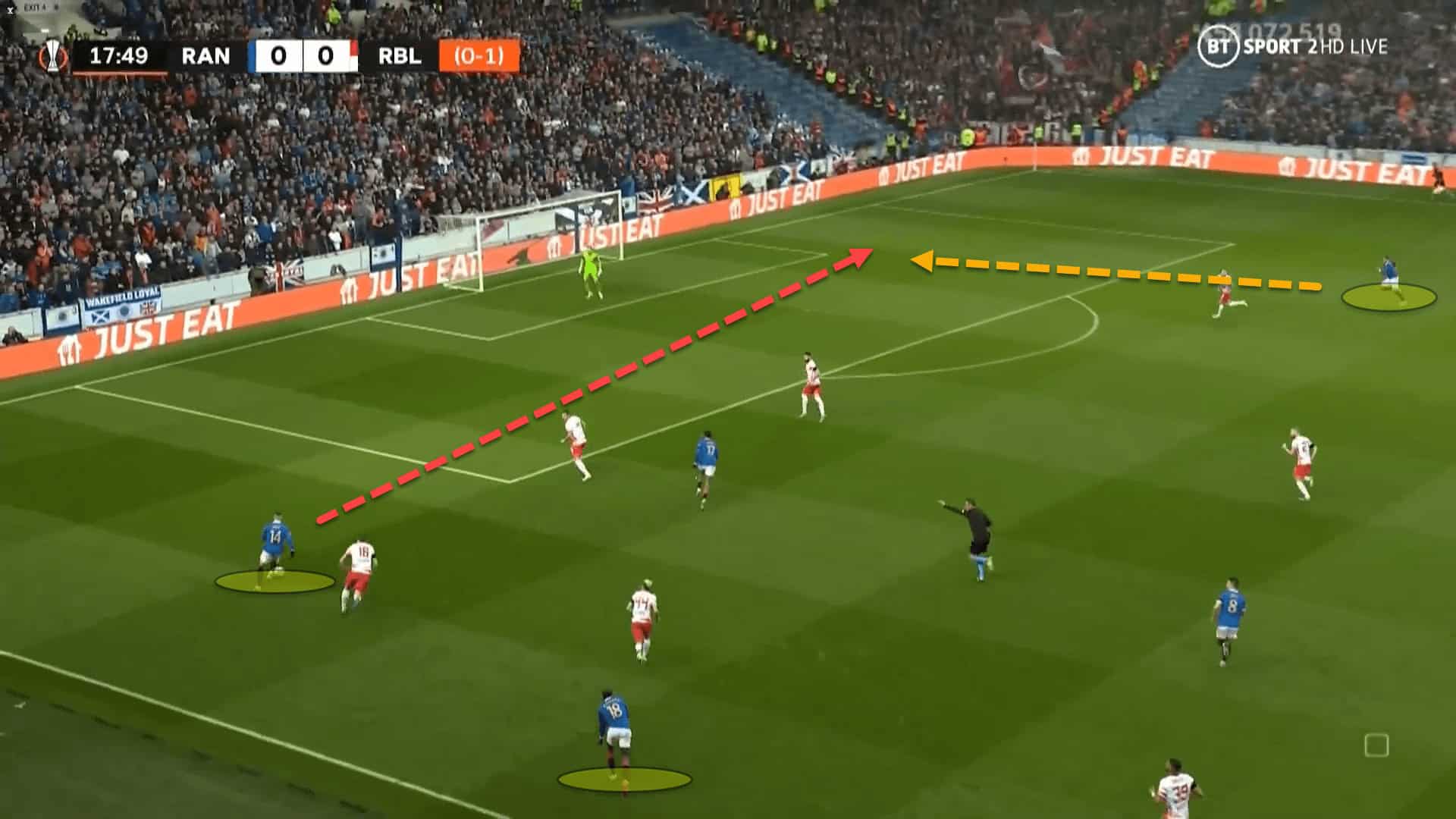 Van Bronckhorst may be from the Netherlands, but Rangers are anything but a stereotypical Dutch-coached team. To combat their inability to break through Leipzig’s compact first and second lines of pressure, Rangers were hitting balls into the channels for runners to latch onto.