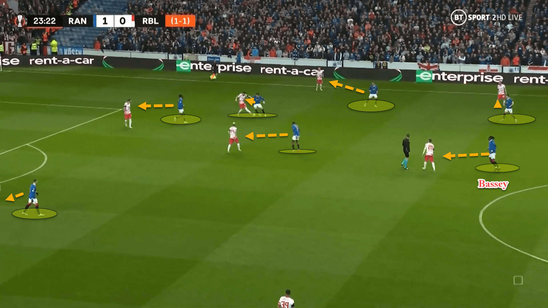 Given Rangers went man-for-man, especially in the middle of the park, one might wonder how van Bronckhorst dealt with Olmo, Nkunku and Poulsen constantly dropping deeper. The answer is that the centre-backs had to follow them into high areas of the pitch, as can be seen by Calvin Bassey’s tight-marking of Olmo for the goal.