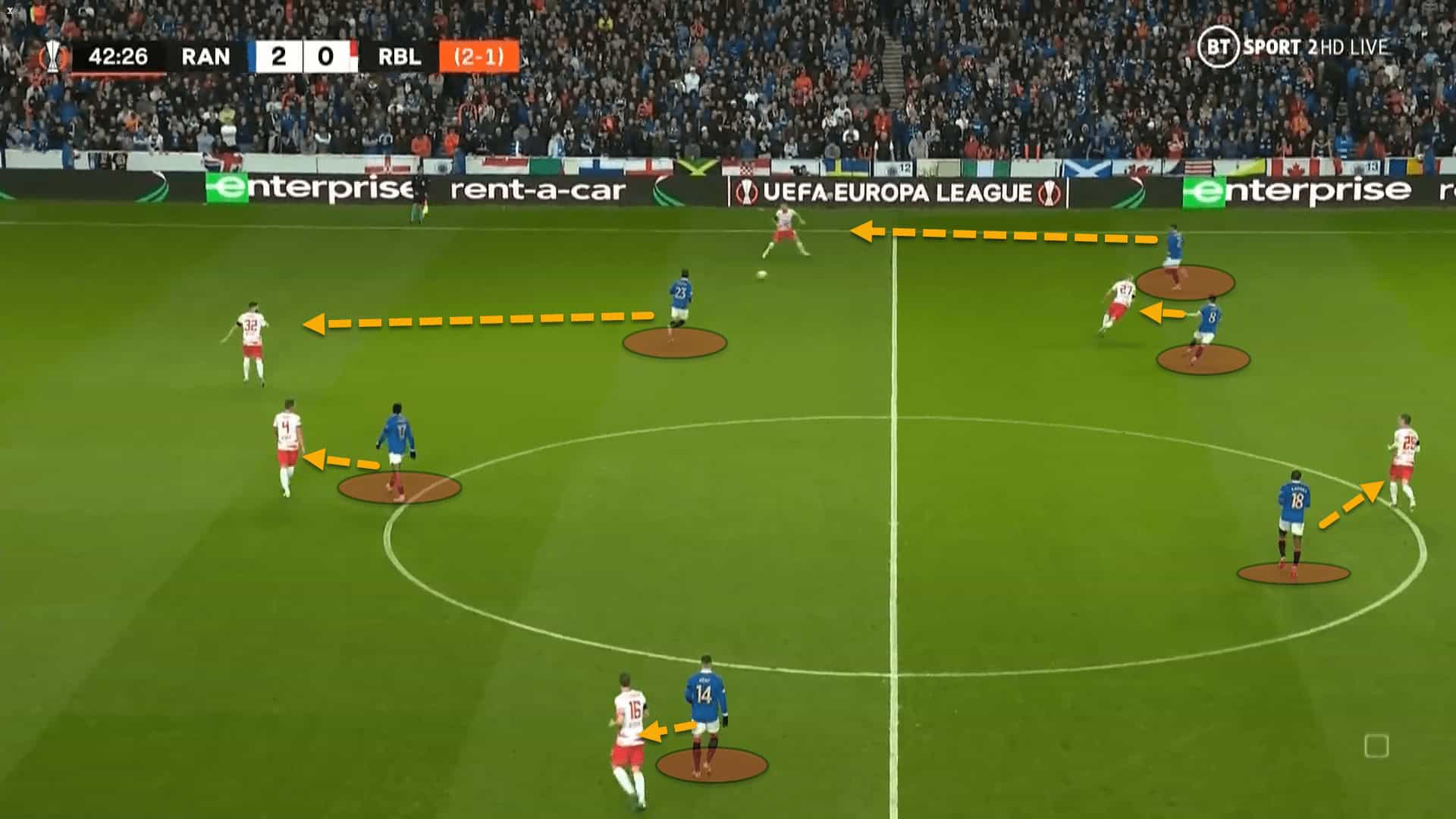 As explained previously, Rangers and Leipzig both defended in a similar manner, especially in the first 45 minutes. However, Rangers went about it slightly differently. Instead of having the front three block off passes into Leipzig’s double-pivot, the Gers went man-for-man in the midfield instead.