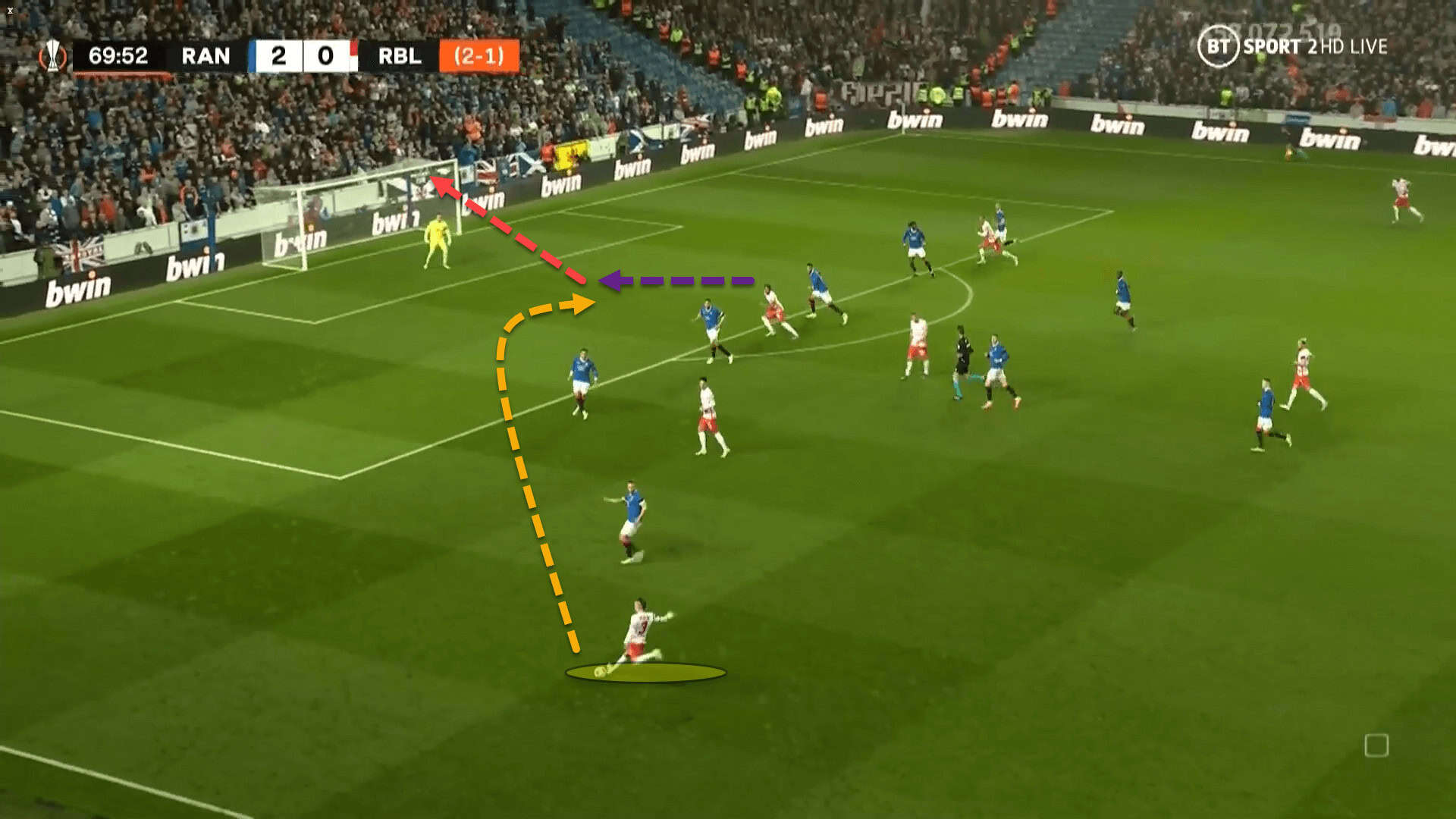 The pair were playing zonally, protecting the area in front of the backline, and so, in theory, didn’t have to worry about Jack or Kamara. Only in cases where Leipzig’s first line of pressure was breached, and the ball reached Rangers’ double-pivot, would either Laimer or Kampl step up to apply pressure to their opposite numbers.