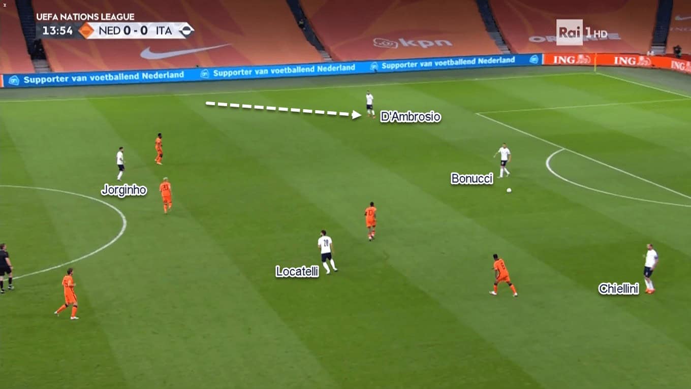 Spinazzola’s forward movement then would leave Italy with three players at the back. However, they would shift accordingly to protect the central lanes. It means Chiellini would drift a bit to the left flank while Danilo D’Ambrosio drops from his designated right-back area.