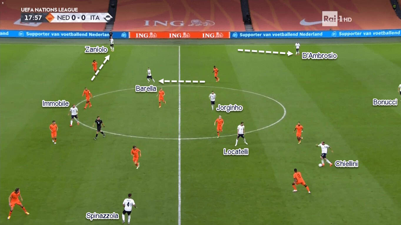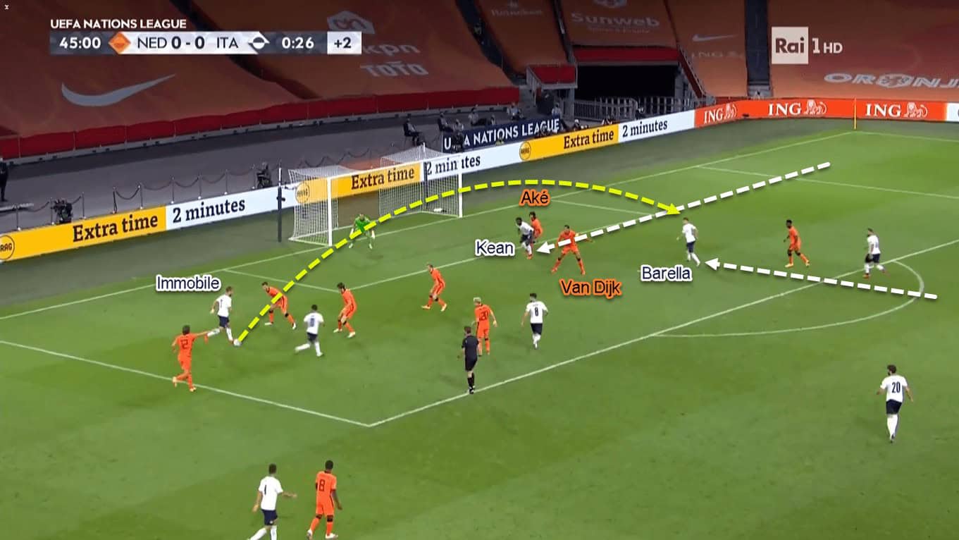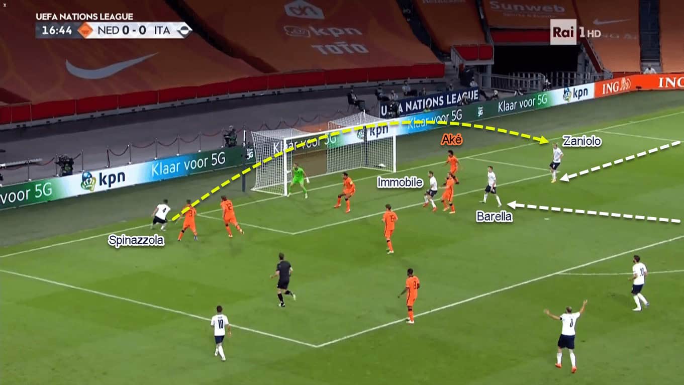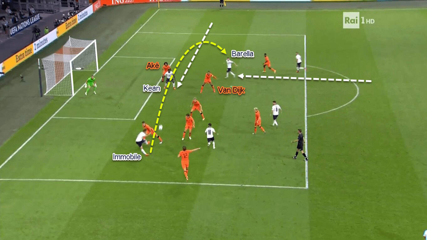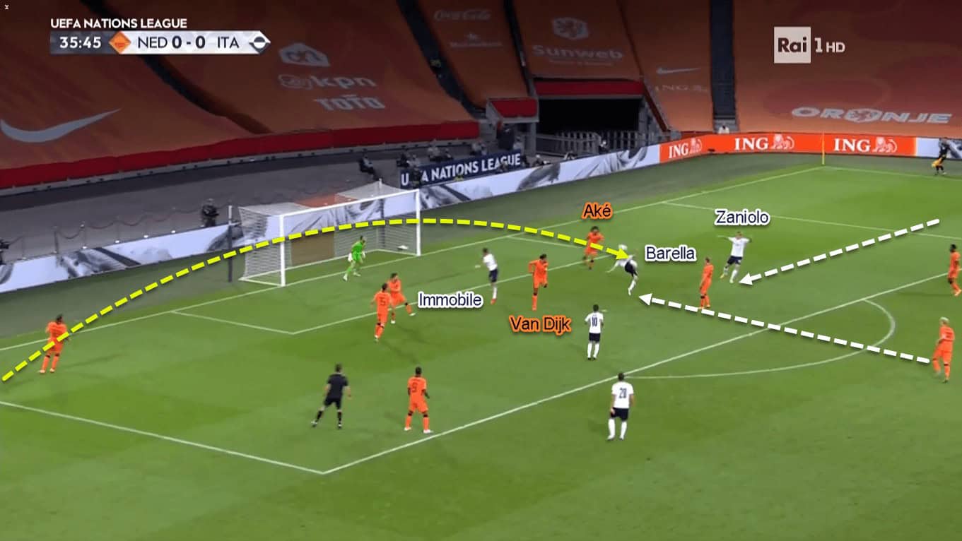 Italy’s triple-threats gave them a numerical and dynamic superiority against the home side. That’s because the Netherlands would only have Van Dijk and Aké to fight aerially against Immobile, Barella, and Zaniolo. Even worse, Immobile’s central position would make Van Dijk completely focused on him; making Aké has two incoming opponents to face simultaneously.