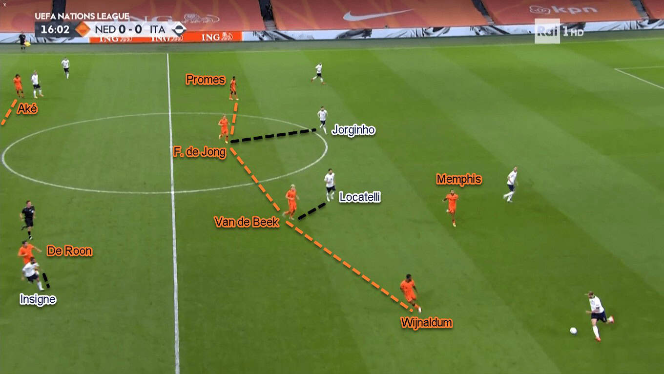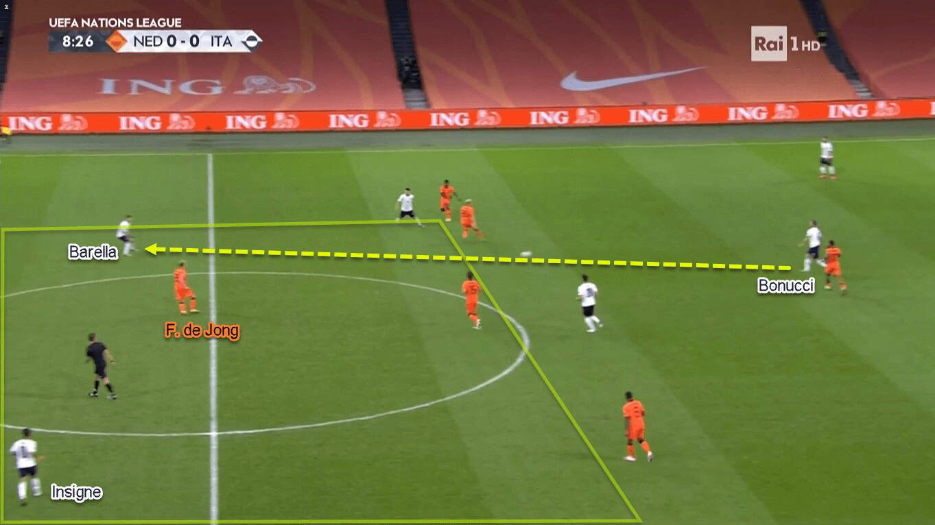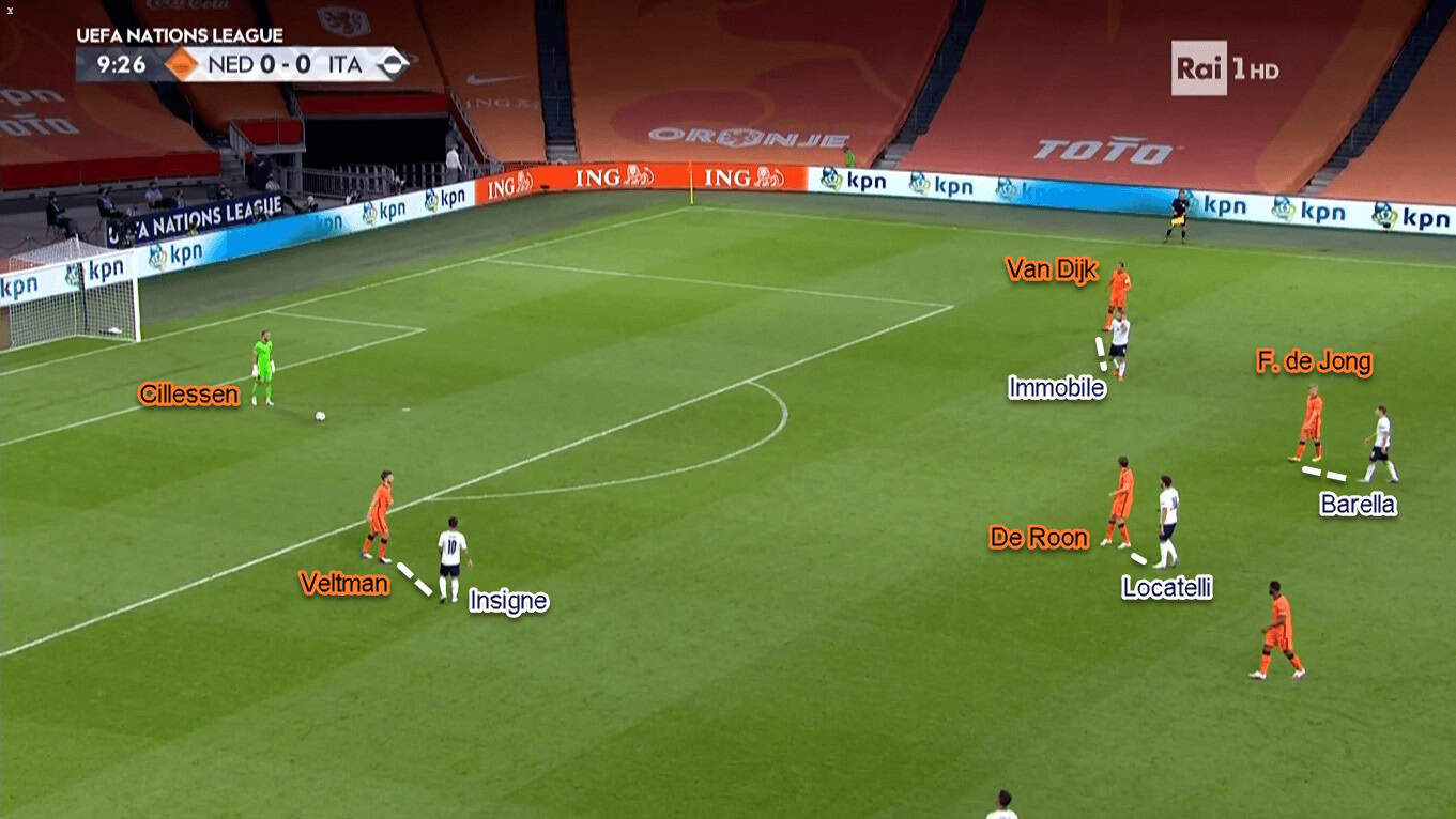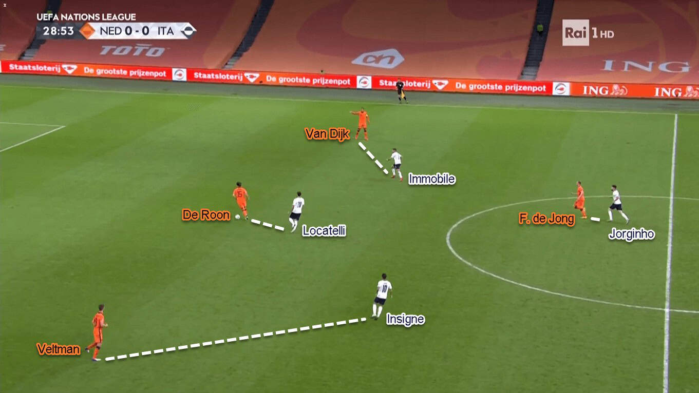 In the lopsided structure, left-winger Insigne joined Immobile in the frontline. Their task was to close Oranje’s centre-backs and prevent them from receiving the ball. Behind them, central midfielders Barella and Locatelli were tasked to close down Frenkie de Jong and Marten de Roon. The Italian midfielders would even follow their designated man even if the opponent drops down in between Veltman and Van Dijk.
